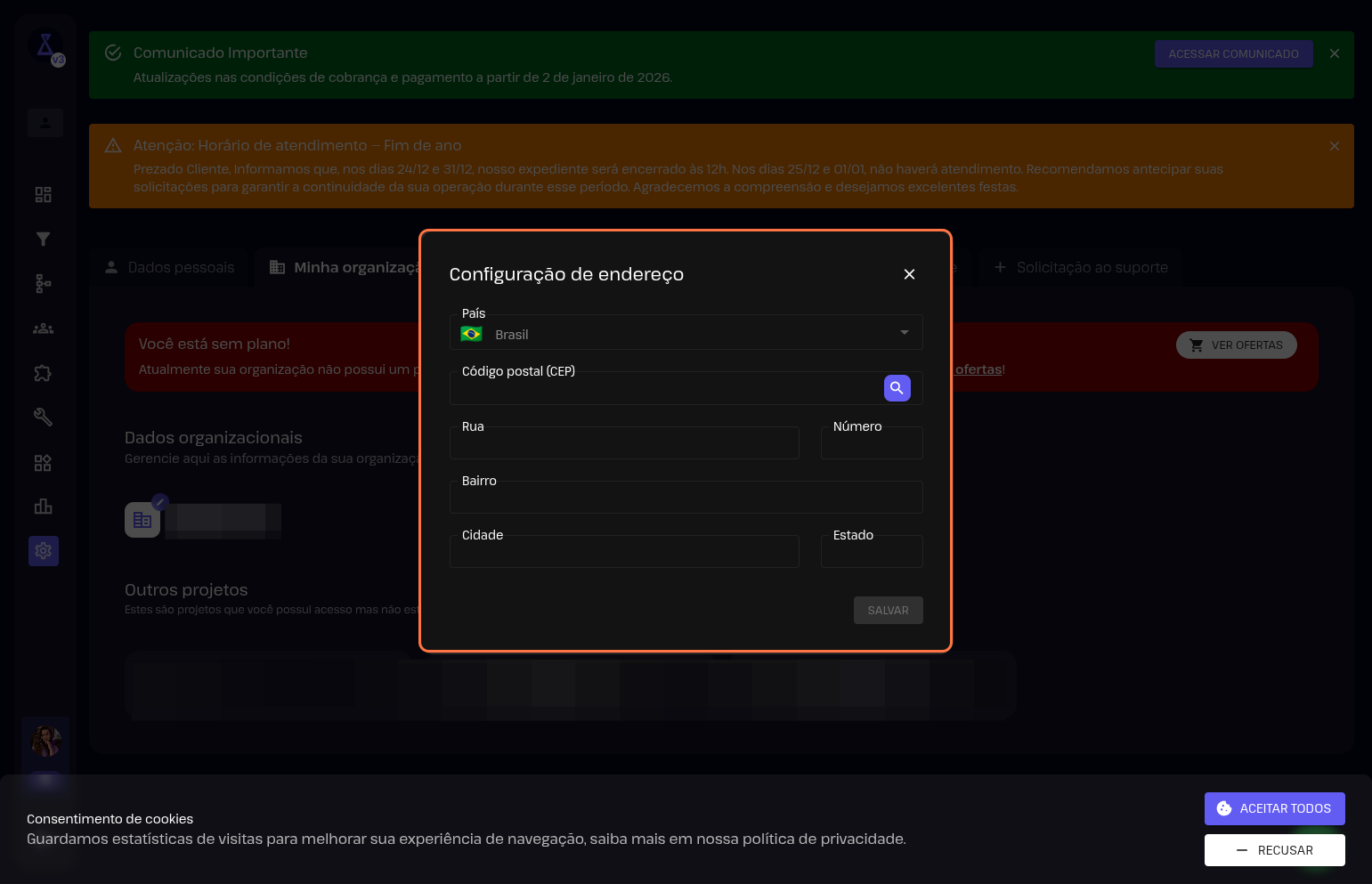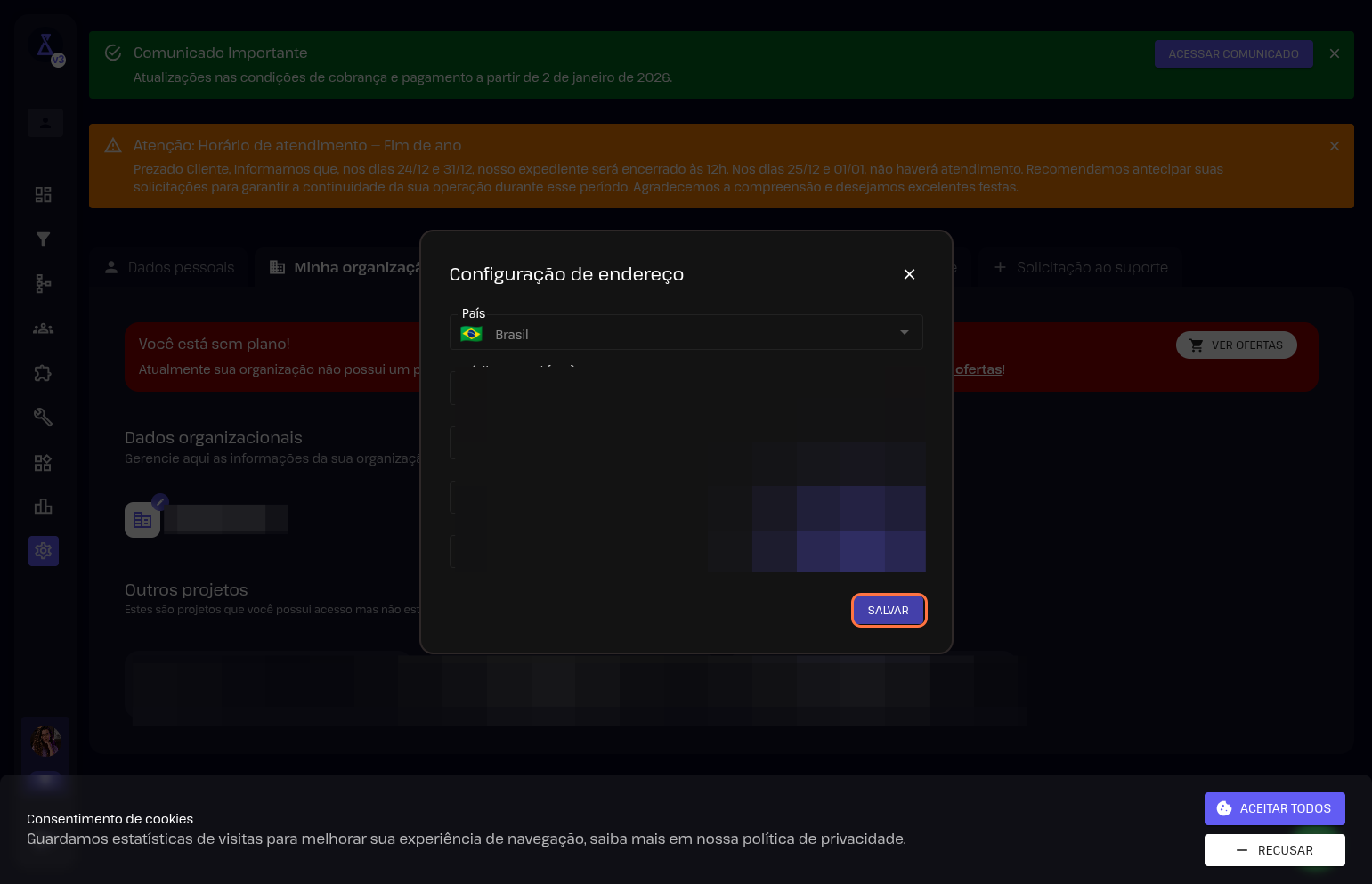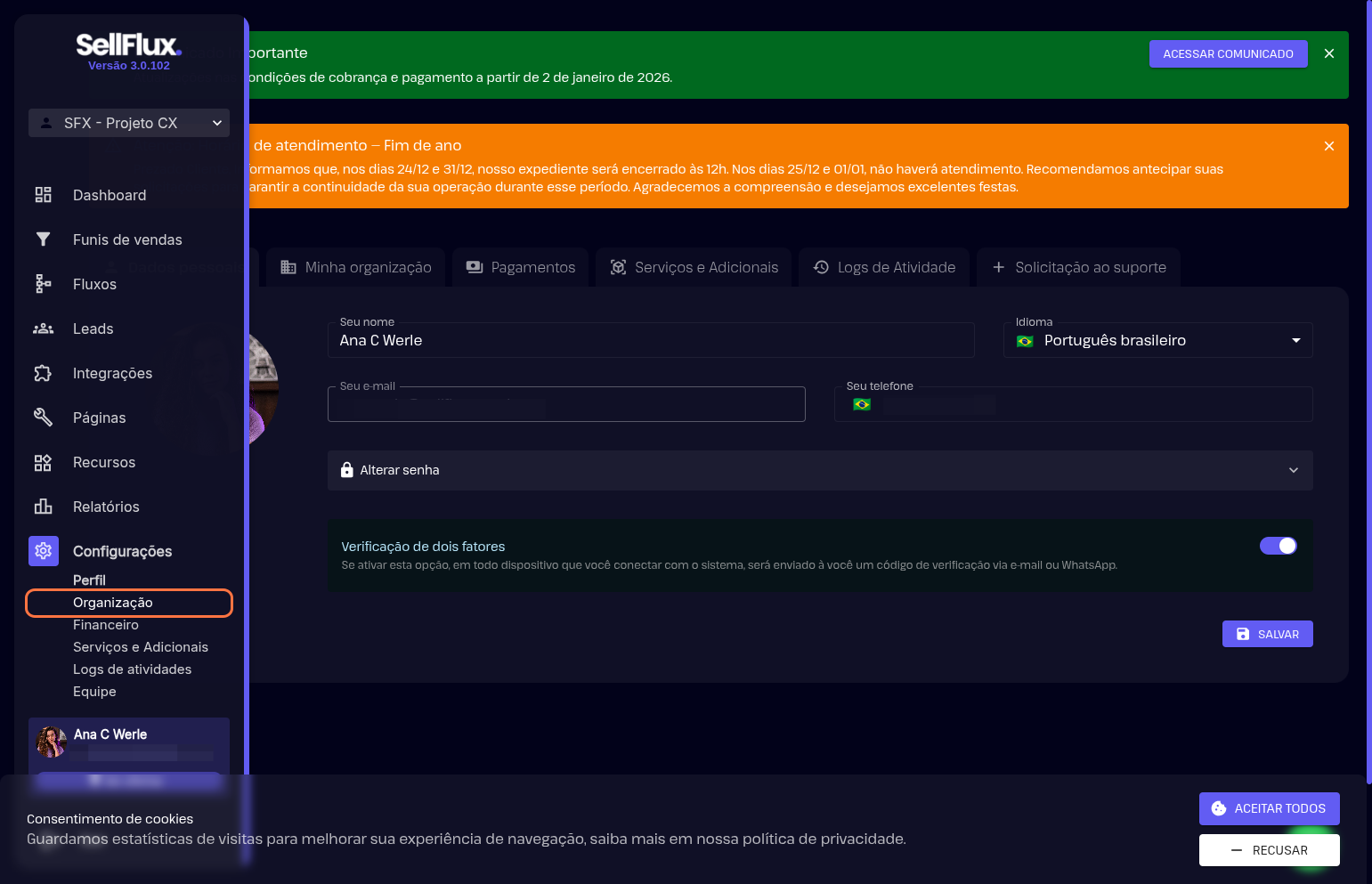 Pronto! Após concluir esses passos, os dados cadastrais da sua organização estarão devidamente atualizados no SellFlux. Sempre que necessário, retorne a essa área para revisar ou ajustar os dados da sua organização.