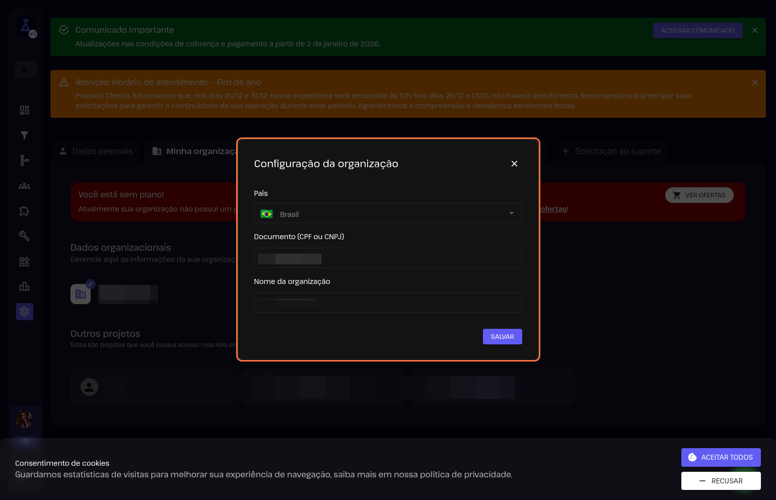 4- Configure os dados da sua organização como País, Documento(CPF ou CNPJ) e dê um nome a organização.