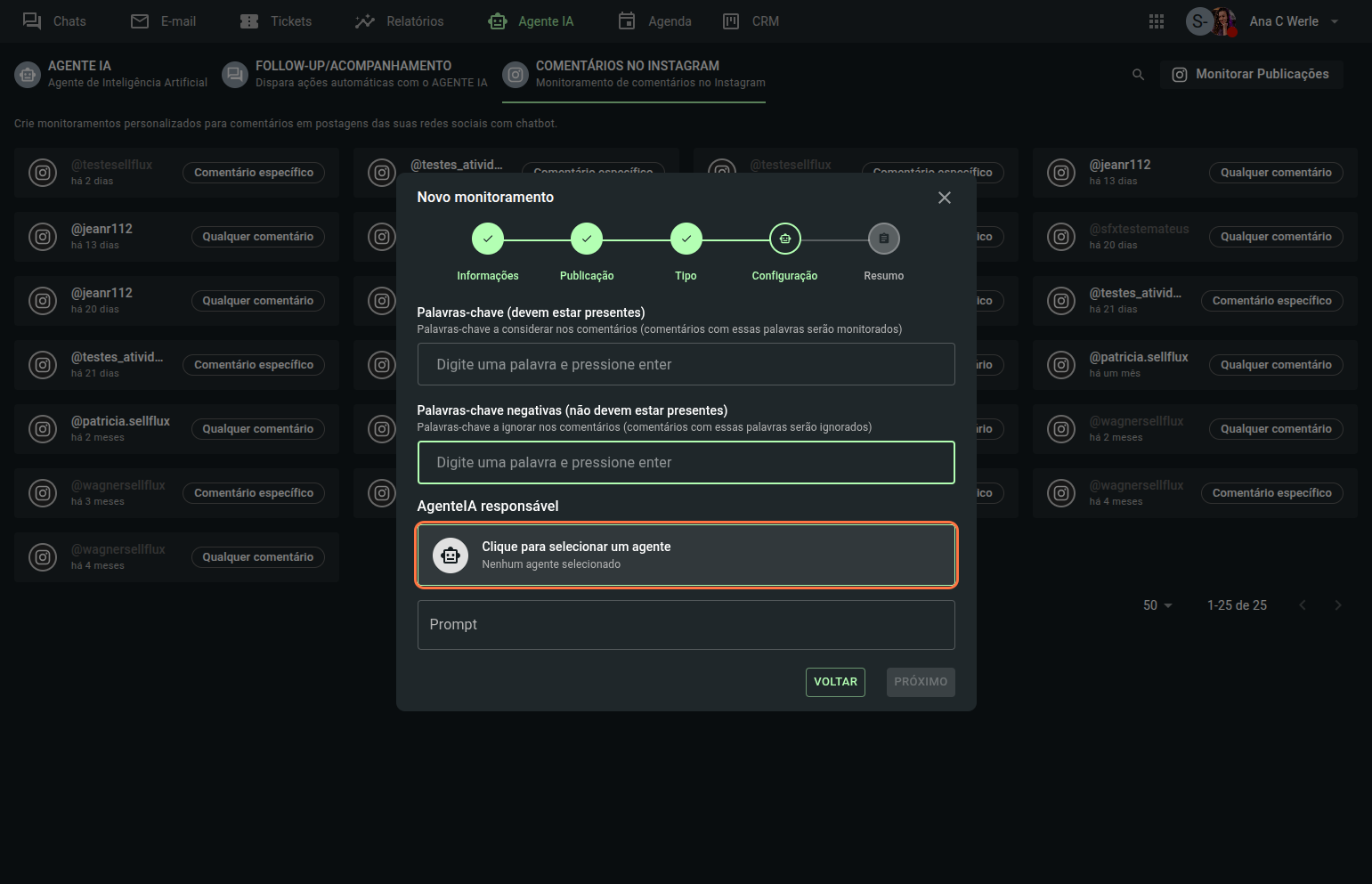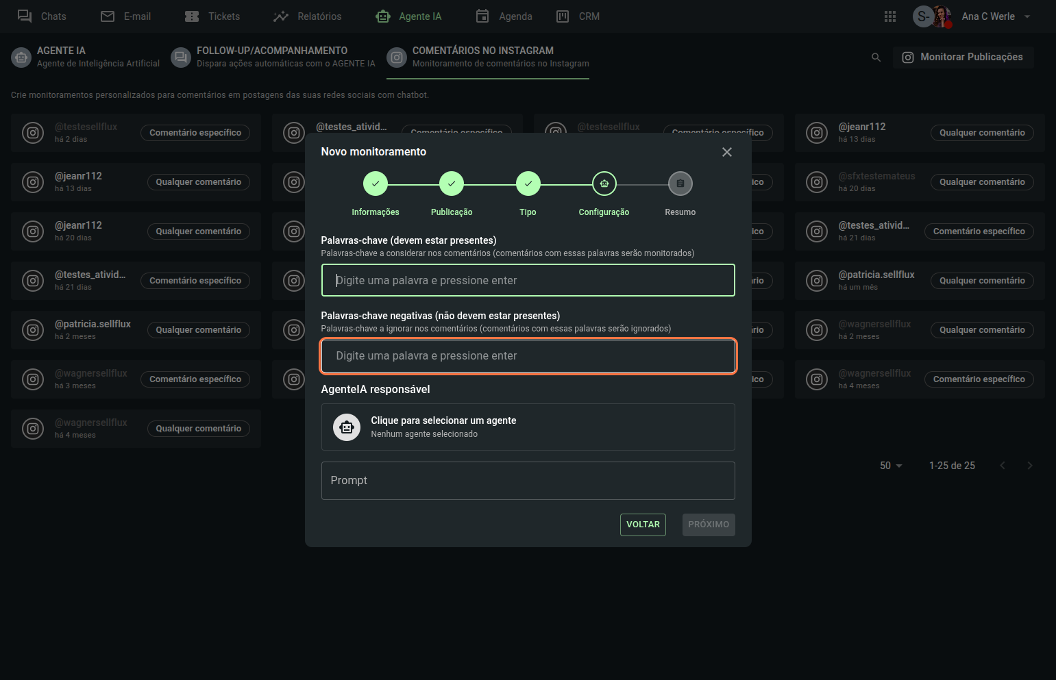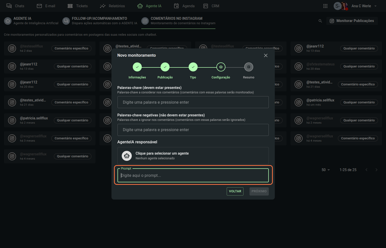 12- Em “prompt” é possível adicionar um prompt adicional ao monitoramento, além daquele que já possui em seu Agente IA. Após configurado clique em avançar.