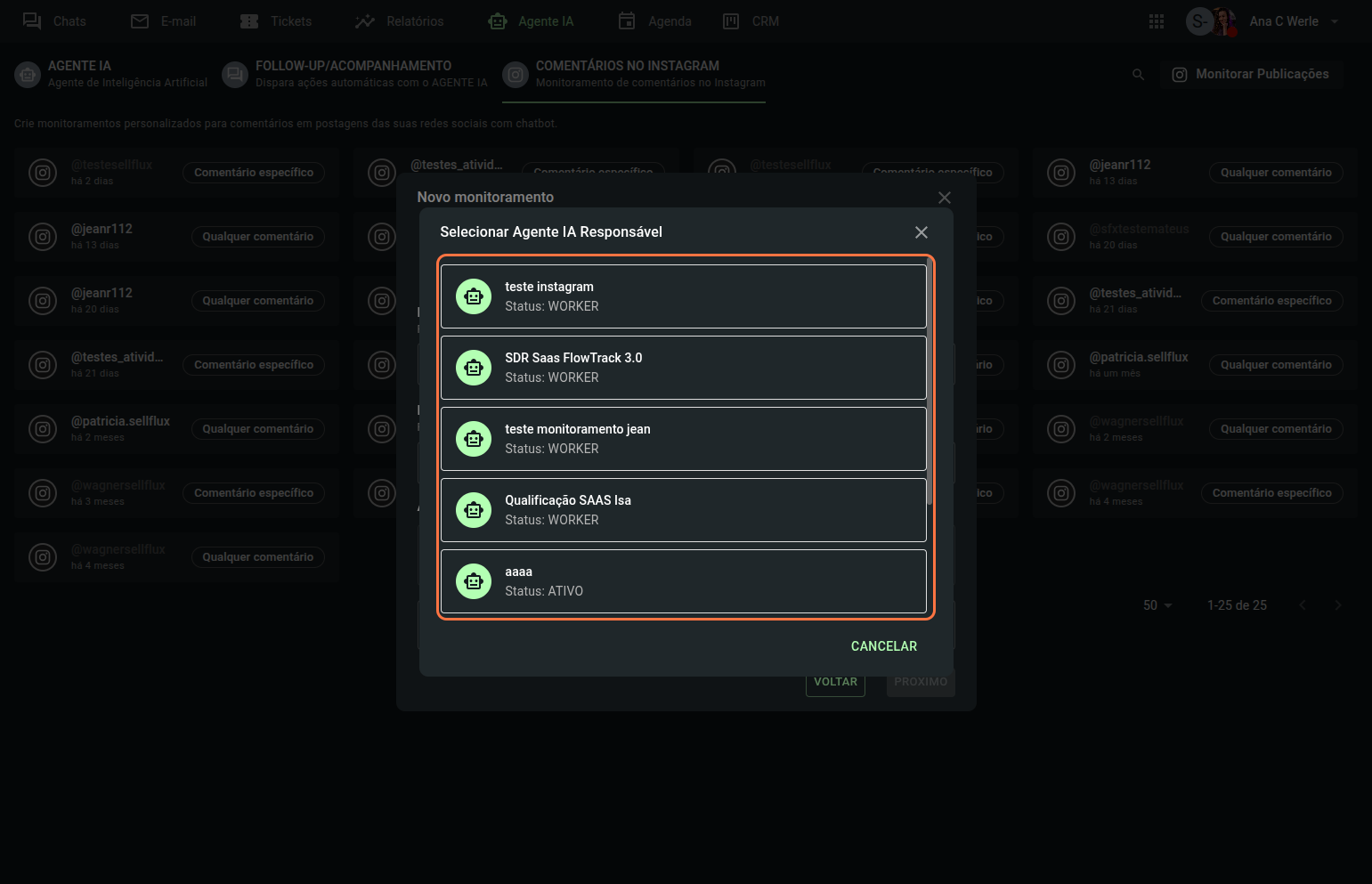 11- Irá aparecer somente os agentes ativos ou em worker. Selecione o desejado.