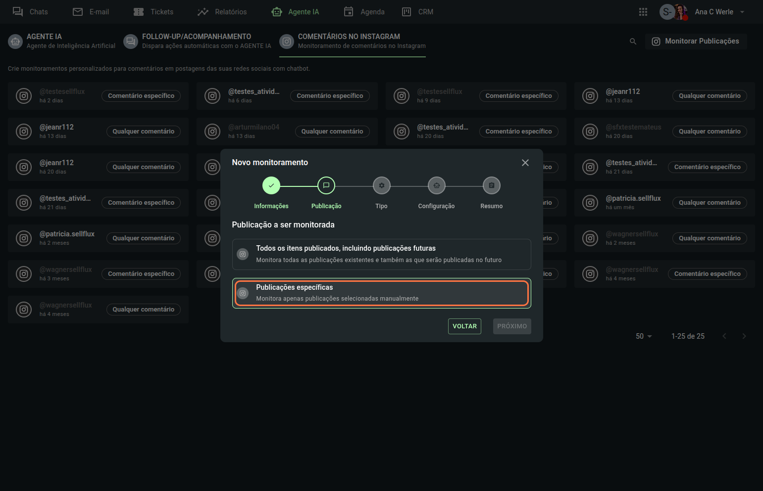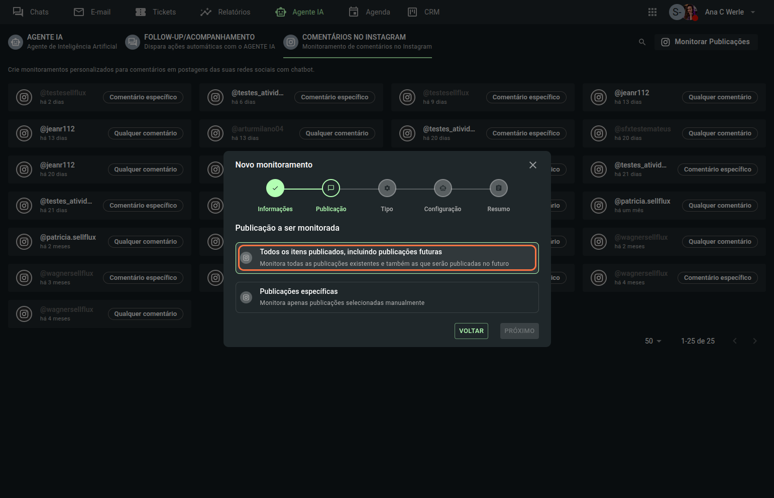 Se selecionar todos os comentários, irá avançar diretamente para a etapa “Configuração”, onde será necessário somente selecionar o agente.