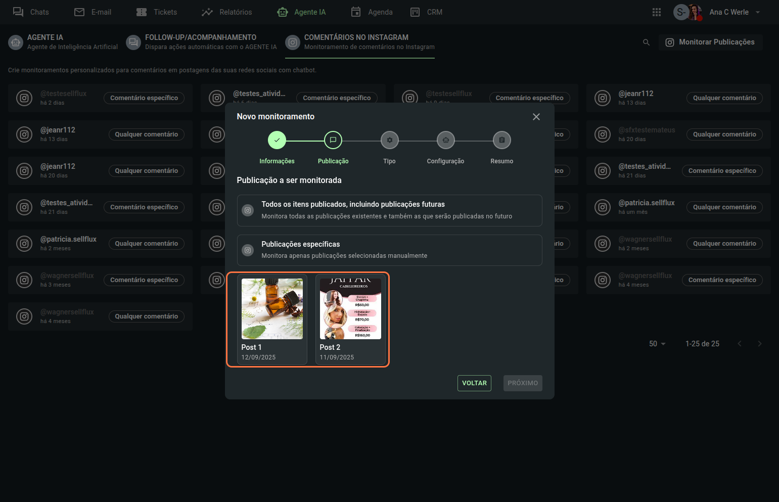 Com isso será exibido as publicações que possui no Instagram selecionado. Basta selecionar a publicação a ser monitorada e seguir para o passo 6 do material.