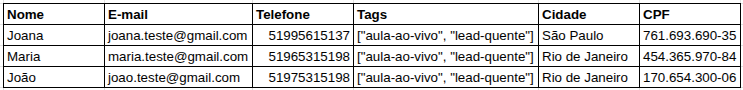 No exemplo acima, o sistema entenderá que deve inserir 2 tags no lead importado, tag "aula-ao-vivo", e a tag "lead-quente". Estas tags não precisam estar previamente cadastradas no Sellflux, pois ao importar a planilha elas serão criadas automaticamente.