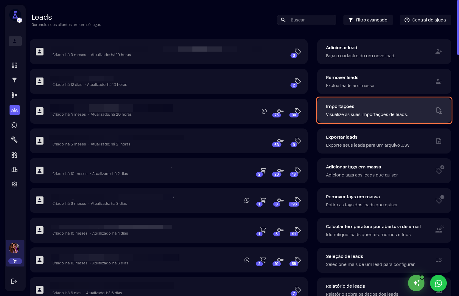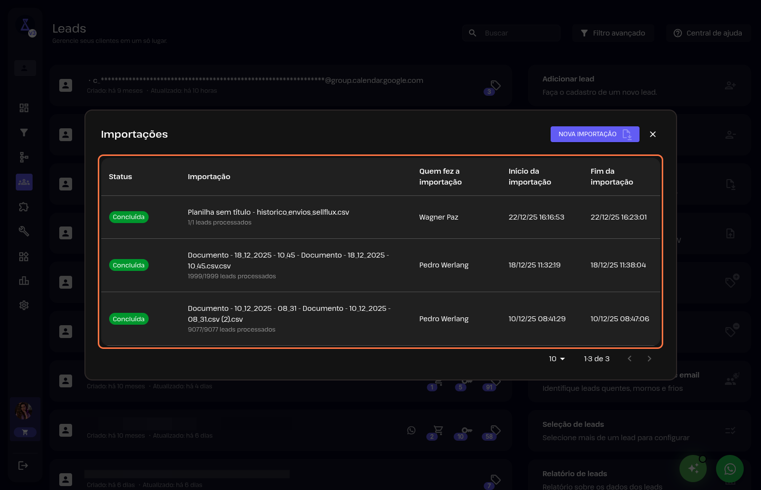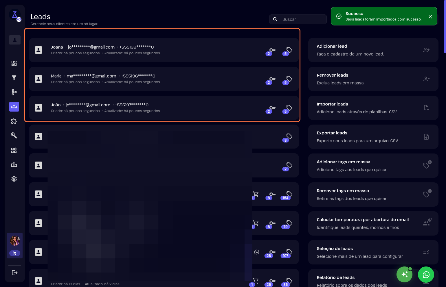 10. Após a conclusão da importação, uma mensagem de sucesso será exibida e os leads importados aparecerão automaticamente na tela de Leads.
