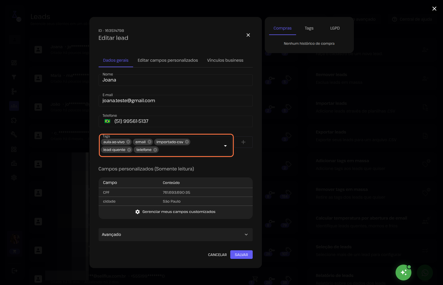 11. Ao clicar em qualquer lead importado, você poderá verificar que ele já está com a tag definida na planilha e, caso tenha sido configurada, também estará com a tag extra aplicada durante a importação.