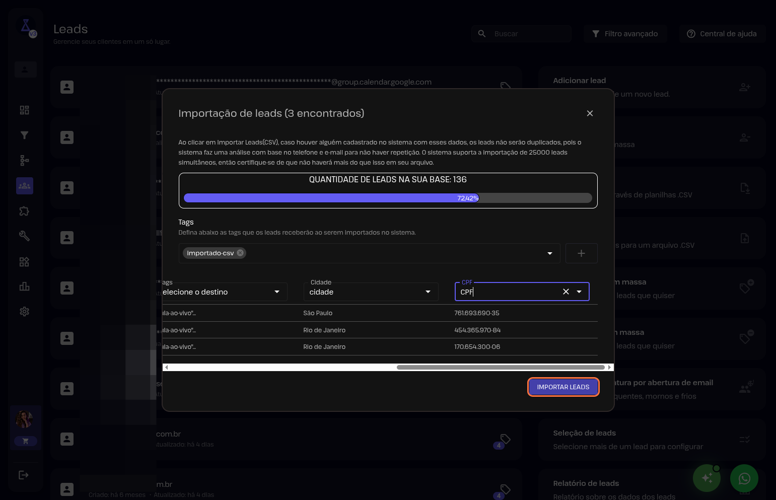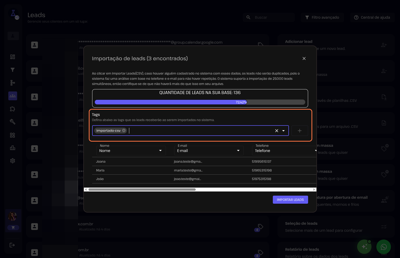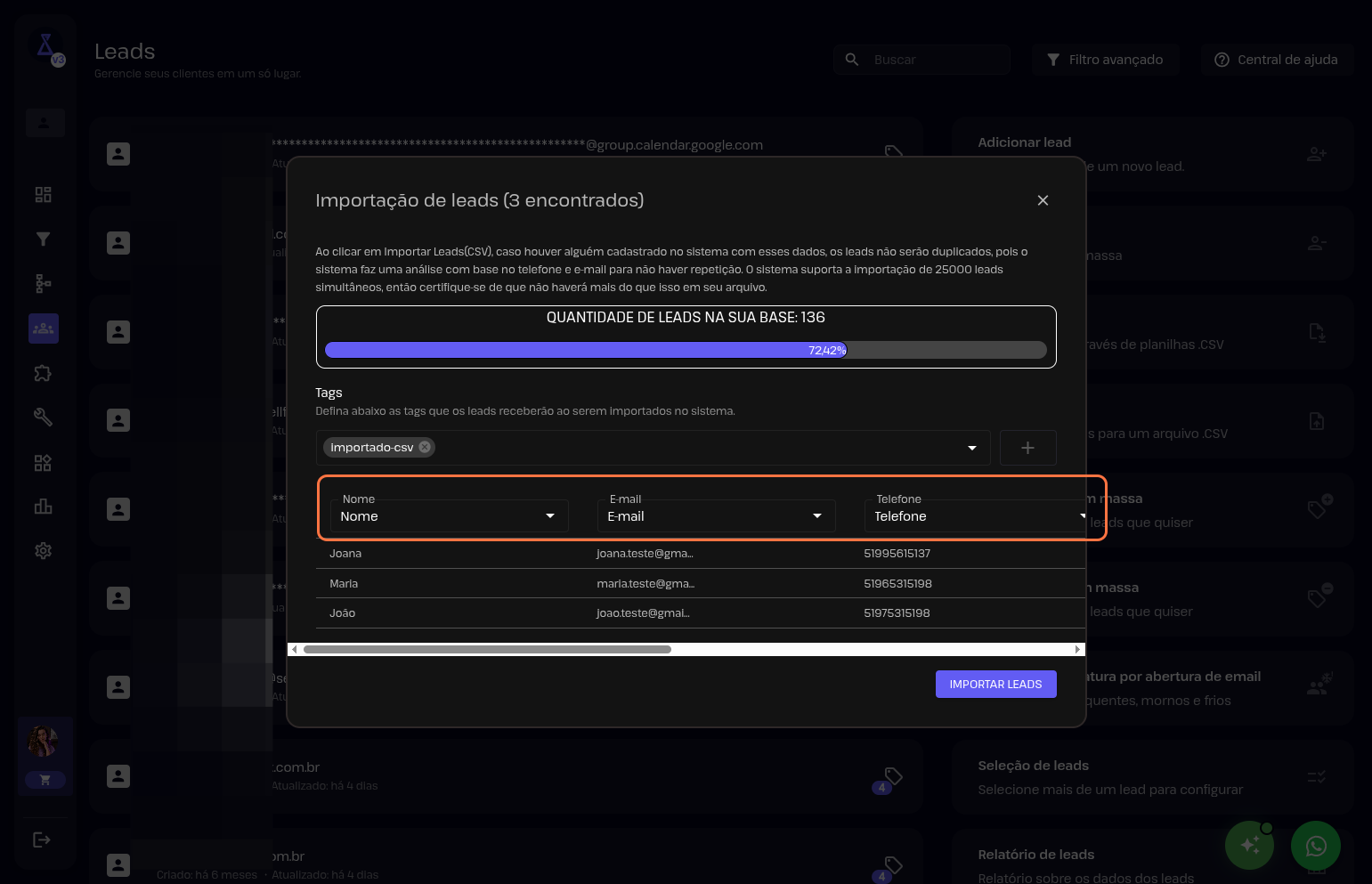Ao clicar em Importar Leads, caso houver alguém cadastrado no sistema com esses dados, os leads não serão duplicados, pois o sistema faz uma análise com base no telefone e e-mail para não haver repetição.