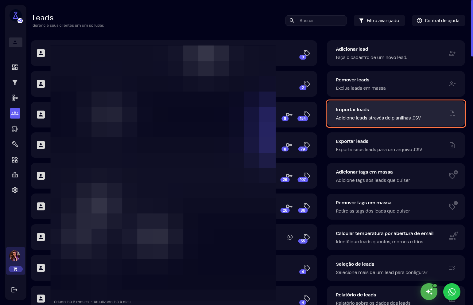 2. Clique na opção "Importar leads". Com isso, será solicitado que selecione o seu arquivo CSV para importar os leads.