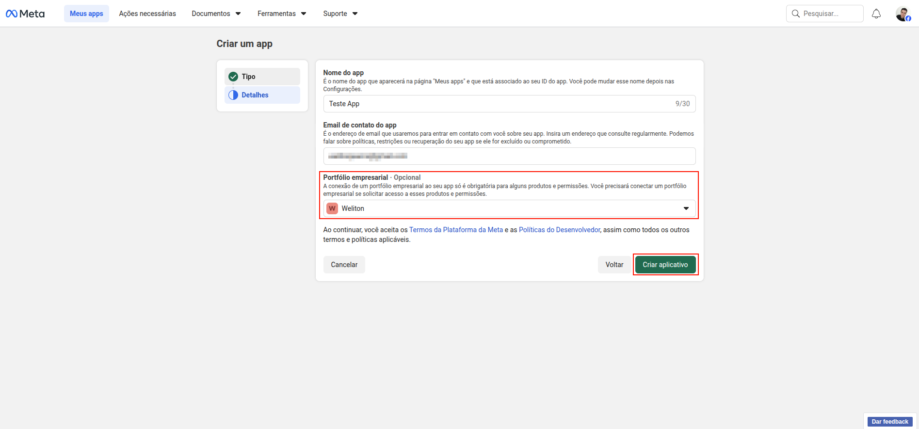 Após concluir os passos acima, a Meta solicitará a senha da sua conta do Facebook para confirmar a criação do aplicativo.
