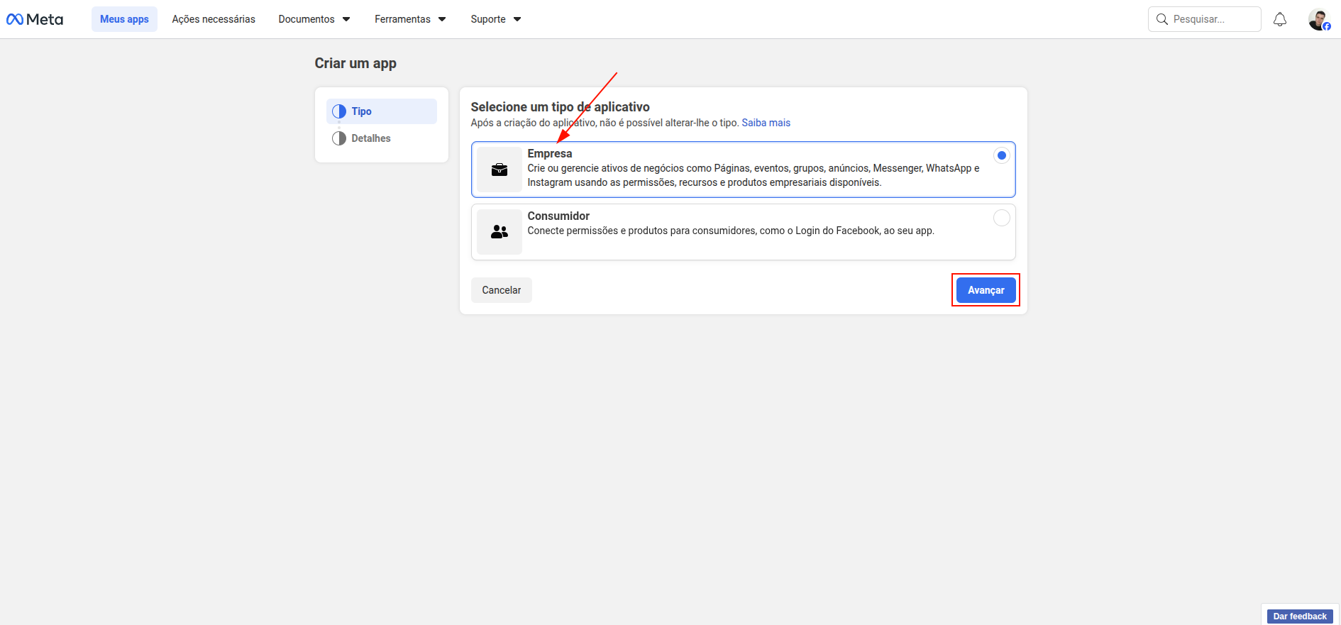 Quando solicitado o tipo de aplicativo, selecione “Empresa”.