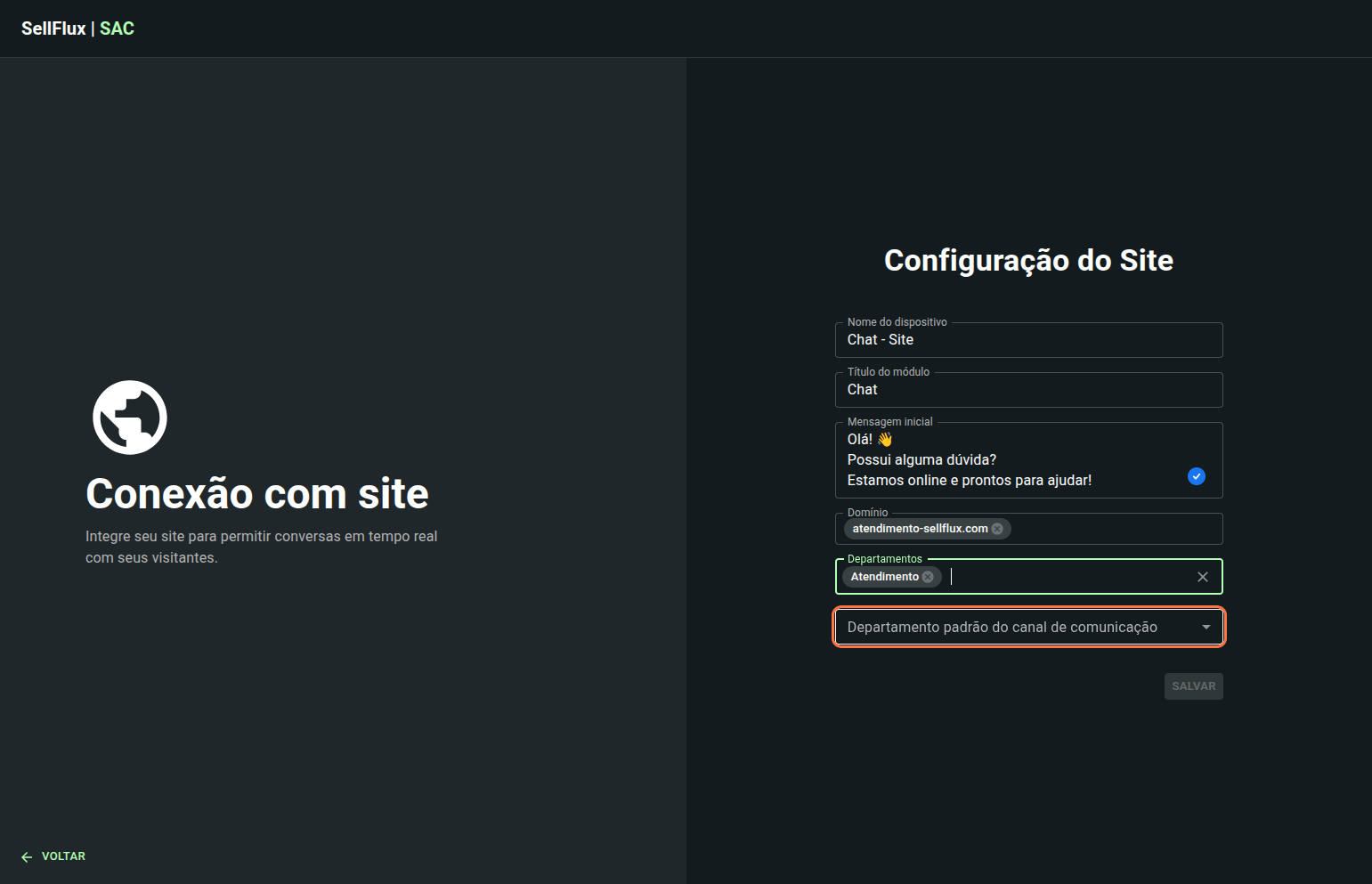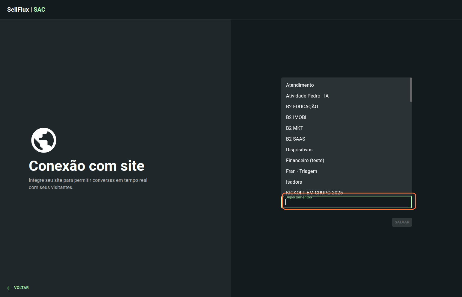 Em seguida, clique em Departamentos e selecione o departamento responsável por receber as mensagens enviadas pelo chat do site.