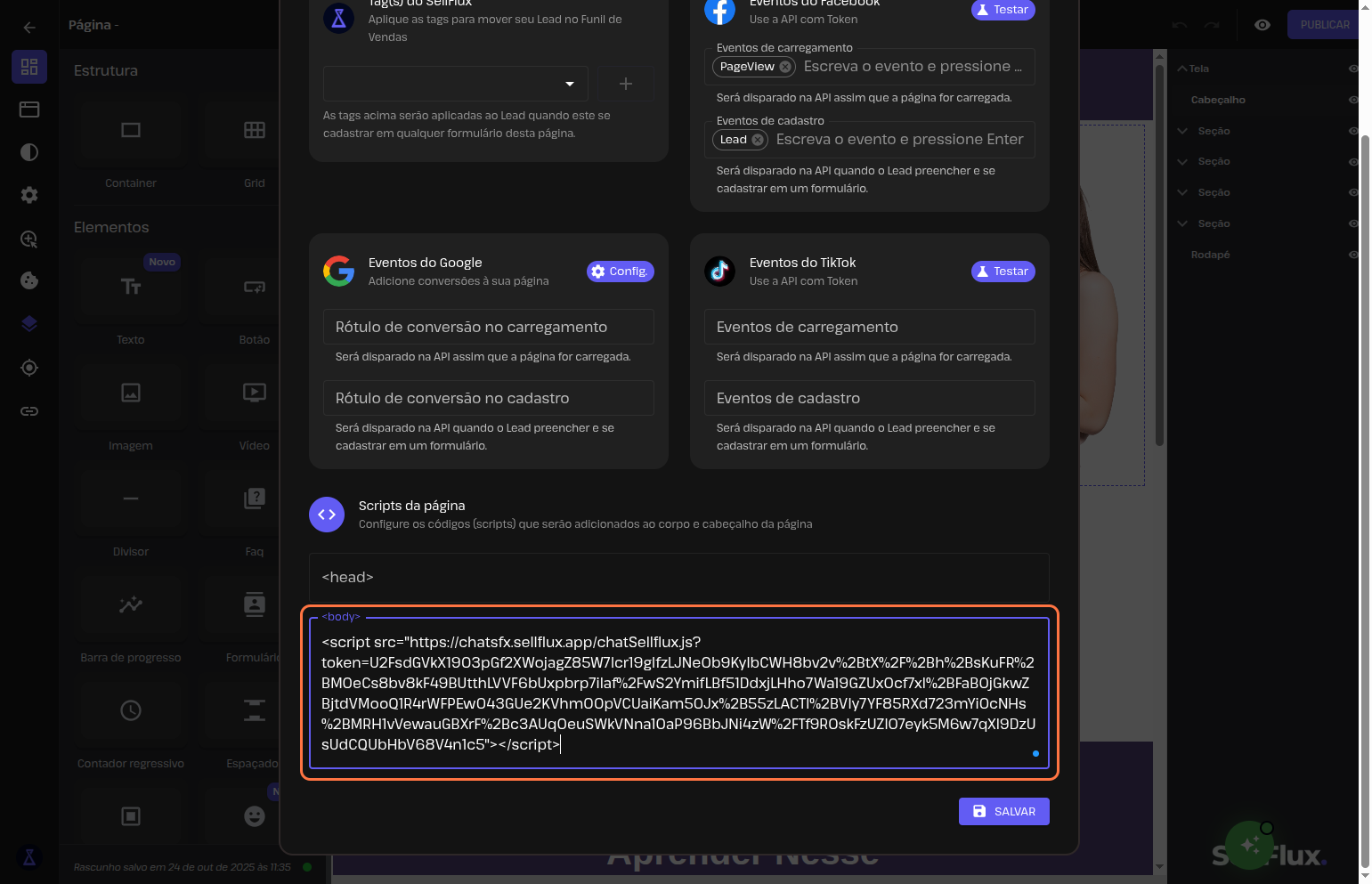 Acesse a página de destino onde o chat será inserido e cole o script fornecido pelo SellFlux dentro da tag <body> da sua página.