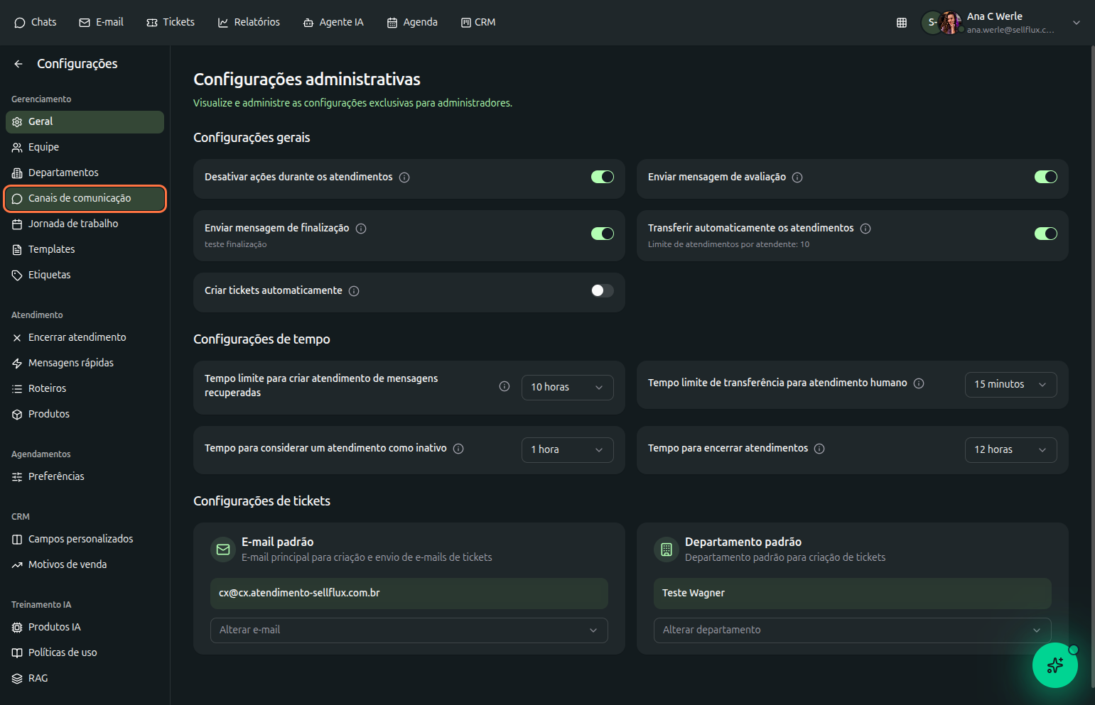 Defina o departamento padrão do canal de comunicação, ou seja, o setor inicial onde todas as conversas serão direcionadas. A partir dele, os atendimentos poderão ser redirecionados automaticamente pela IA ou manualmente pelos atendentes para outros departamentos, conforme necessário.