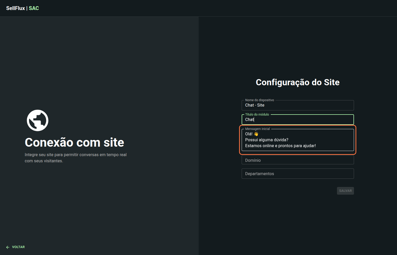 Clique no campo Mensagem inicial e personalize o texto conforme desejar. Essa será a saudação exibida no chat assim que o visitante clicar no botão dentro da sua página.