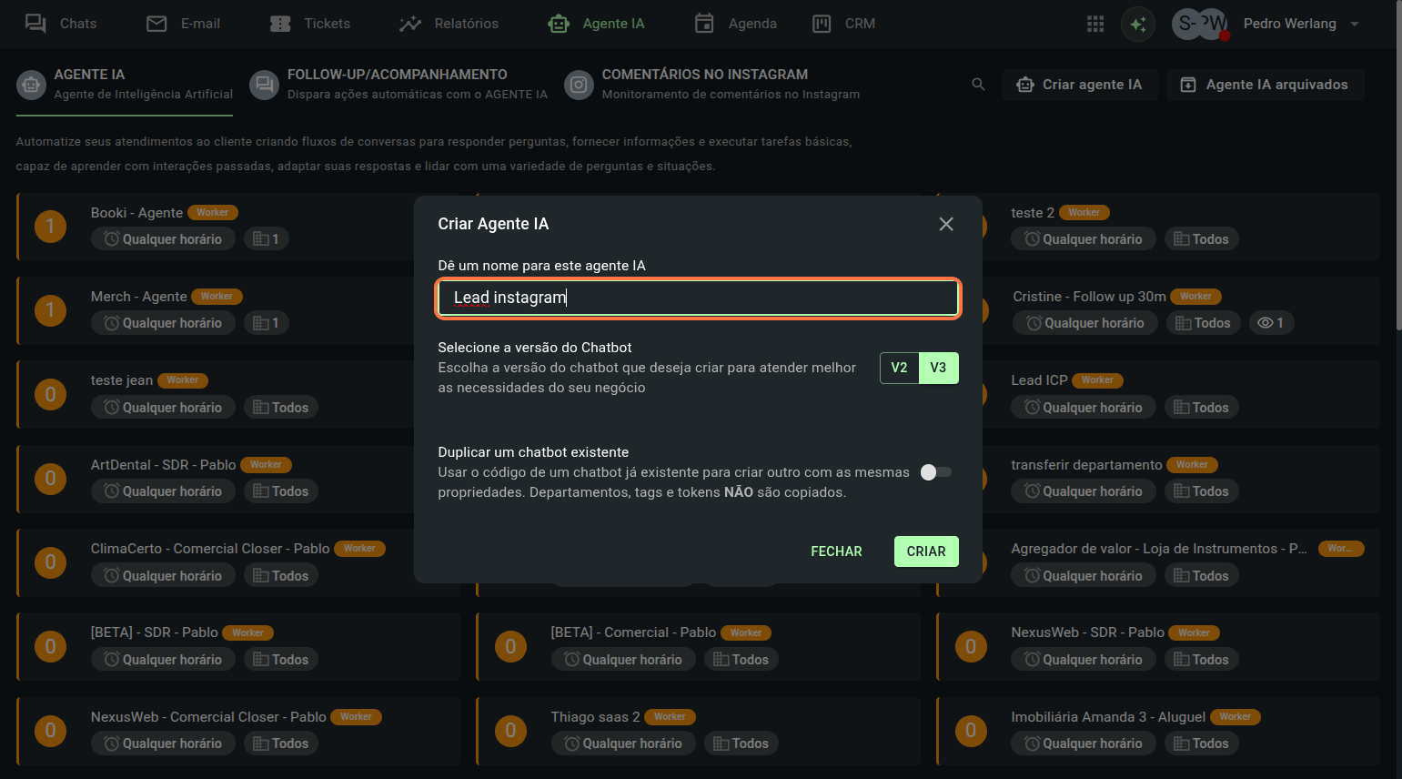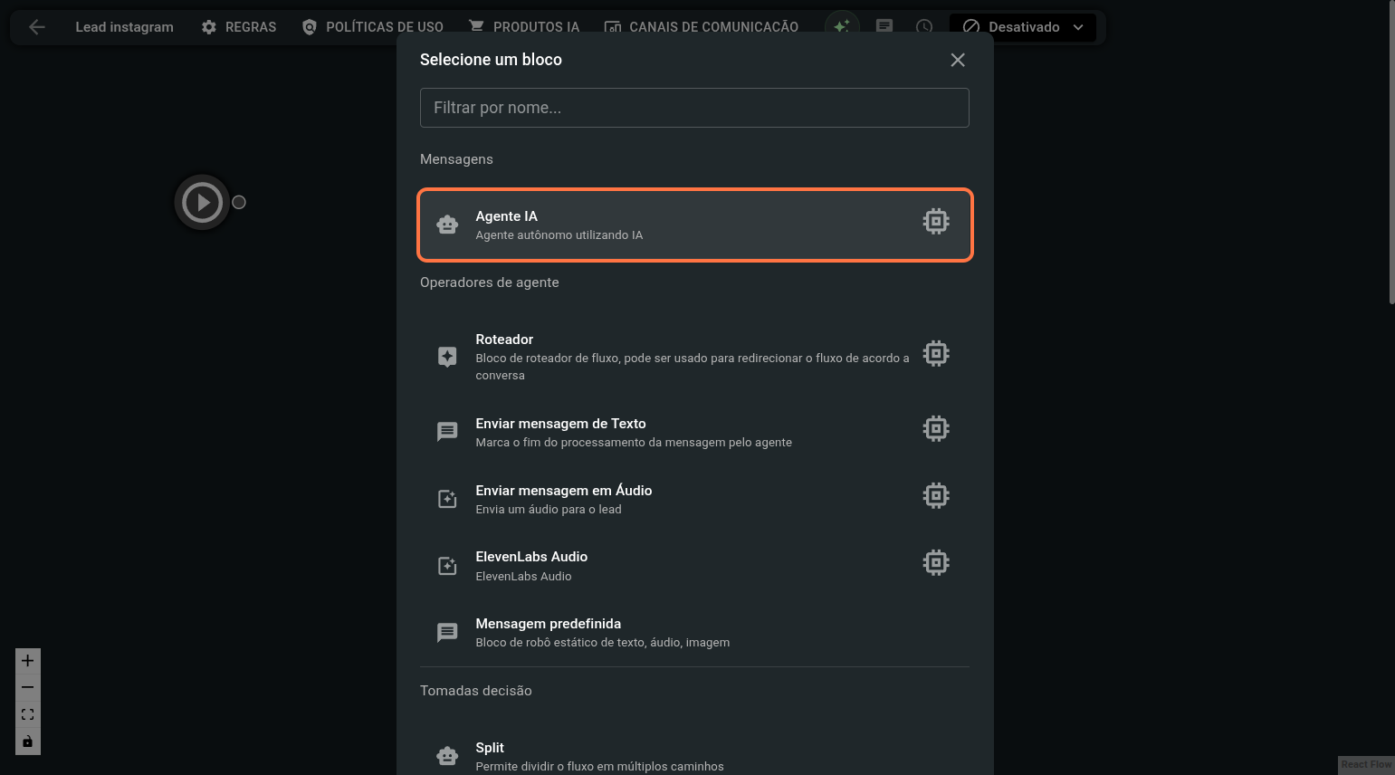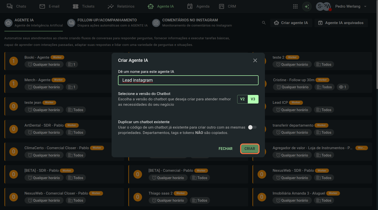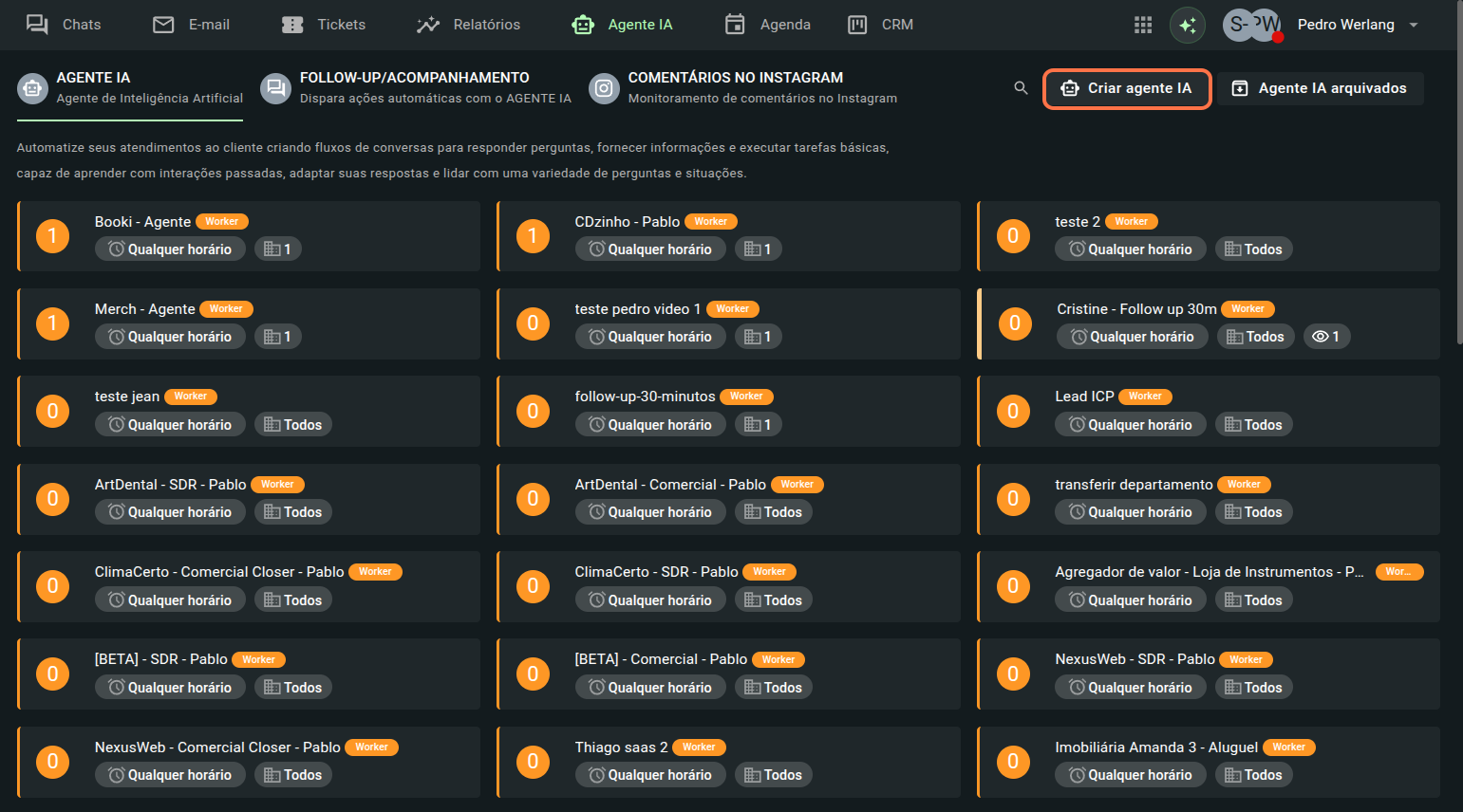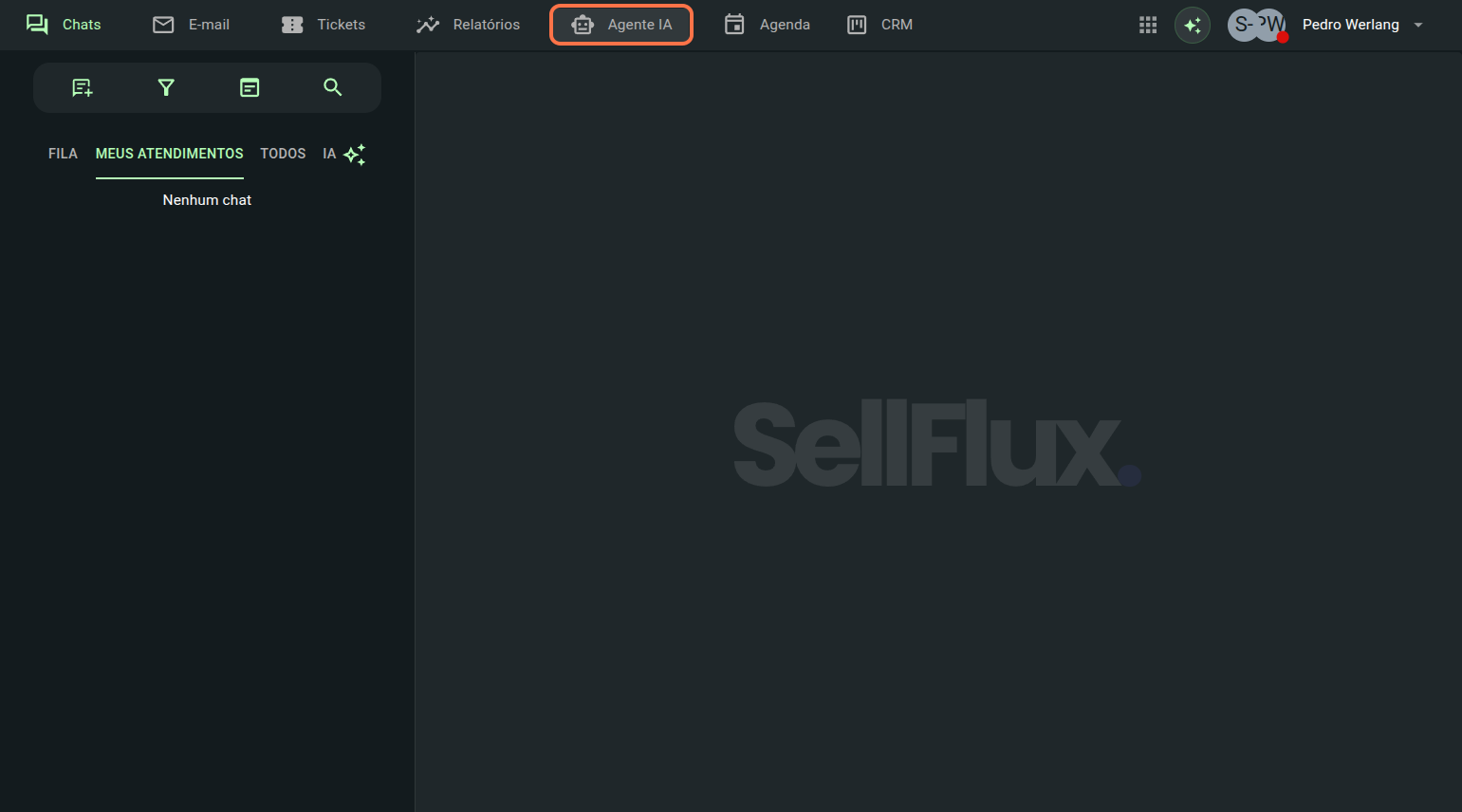1- Para iniciarmos o processo, precisaremos criar um agente IA. Clique na aba Agente IA.