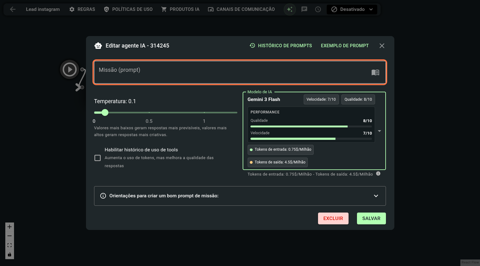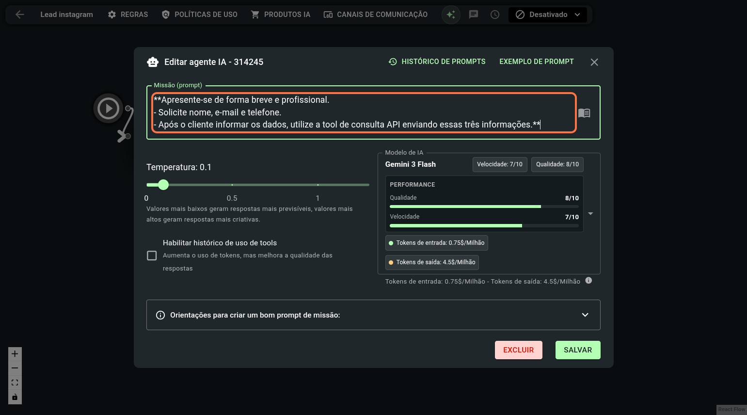 9- Dentro do agente, é necessário que seja definido um prompt de comando de atendimento, onde a IA irá seguir o roteiro definido.