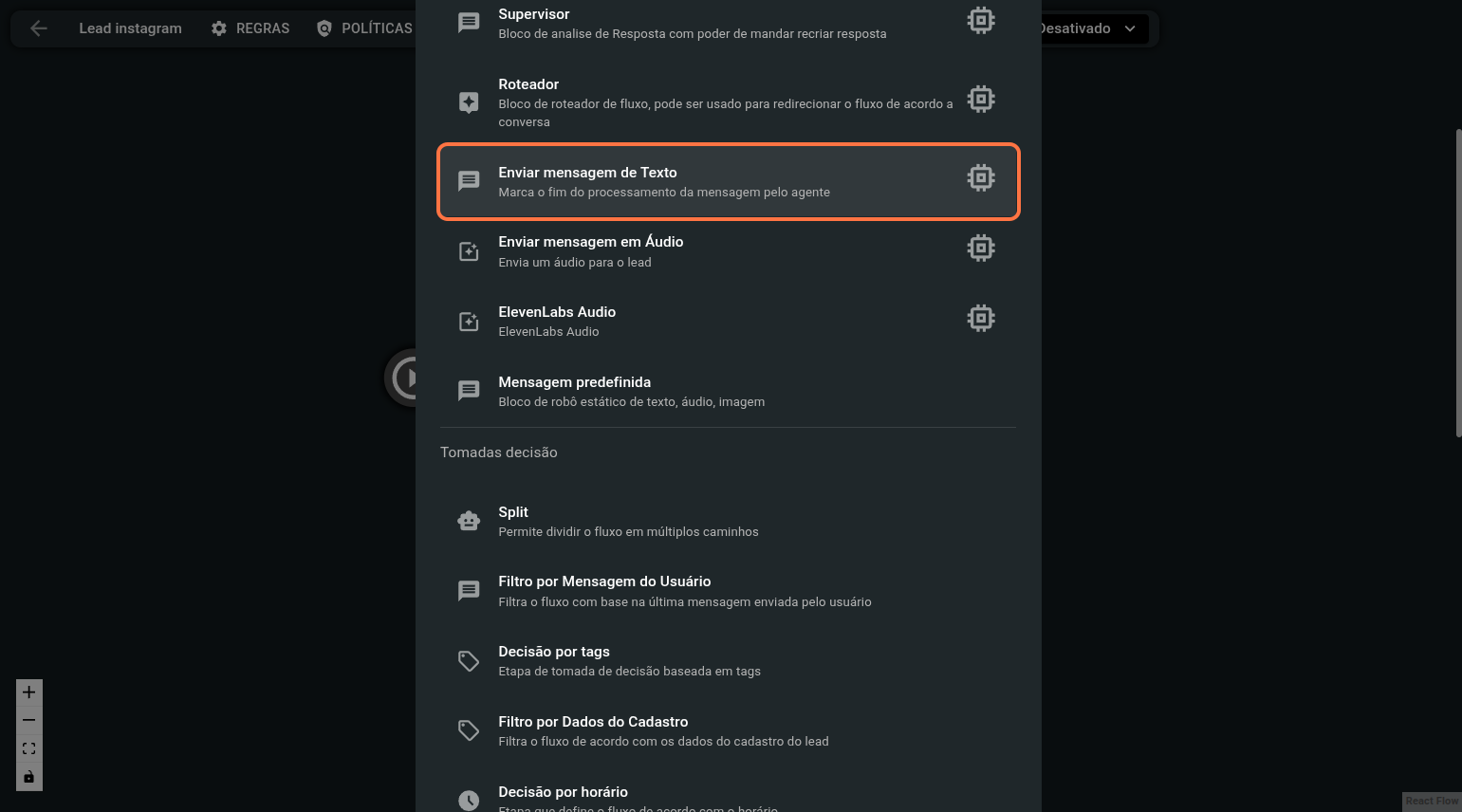 13- Selecione o bloco de enviar mensagem de texto para que a mensagem processada pelo agente seja enviada ao seu cliente.