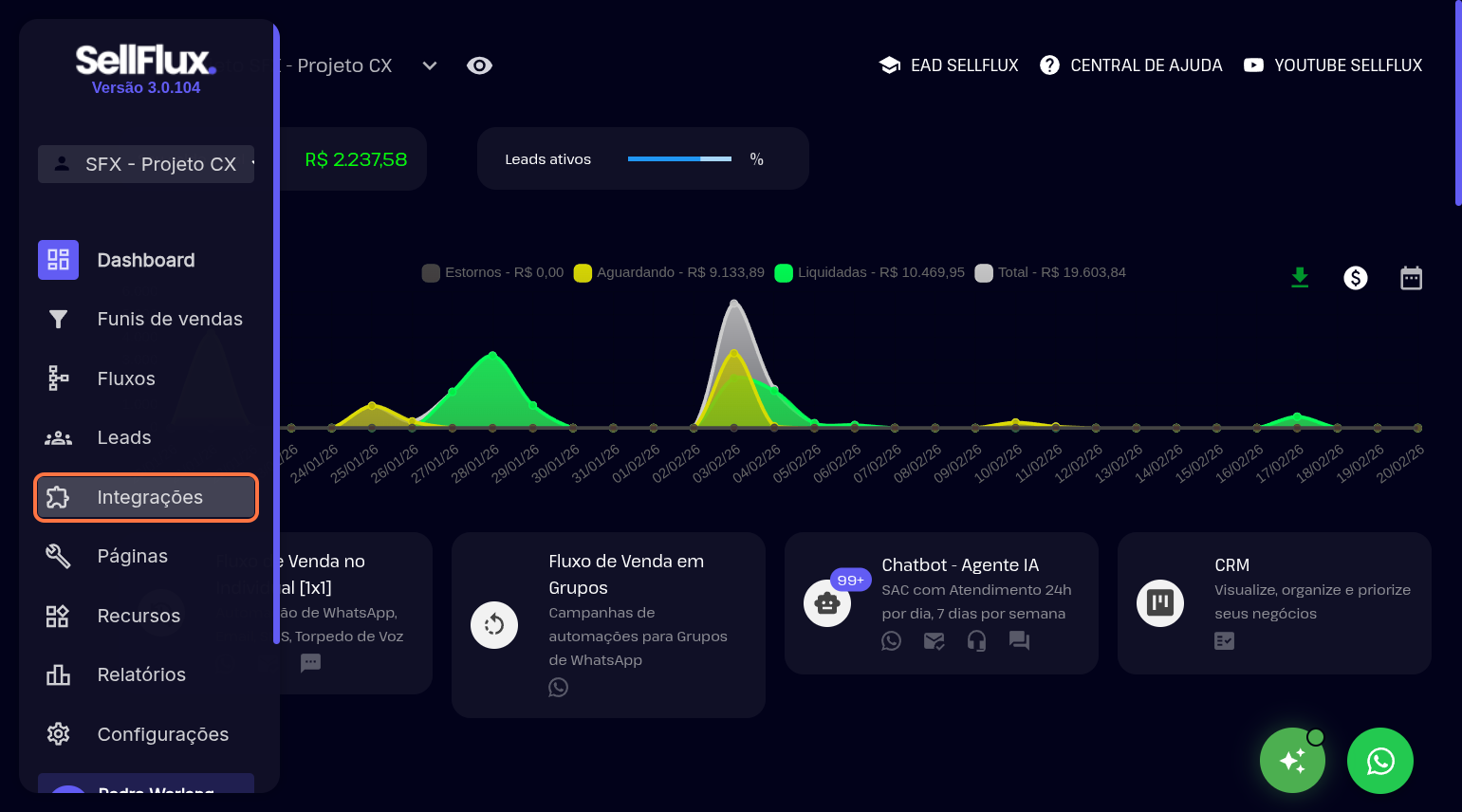 16- Com isso feito, precisaremos acessar o Master Sellflux, no menu lateral esquerdo, clique em integrações.