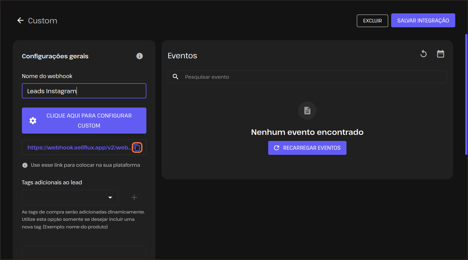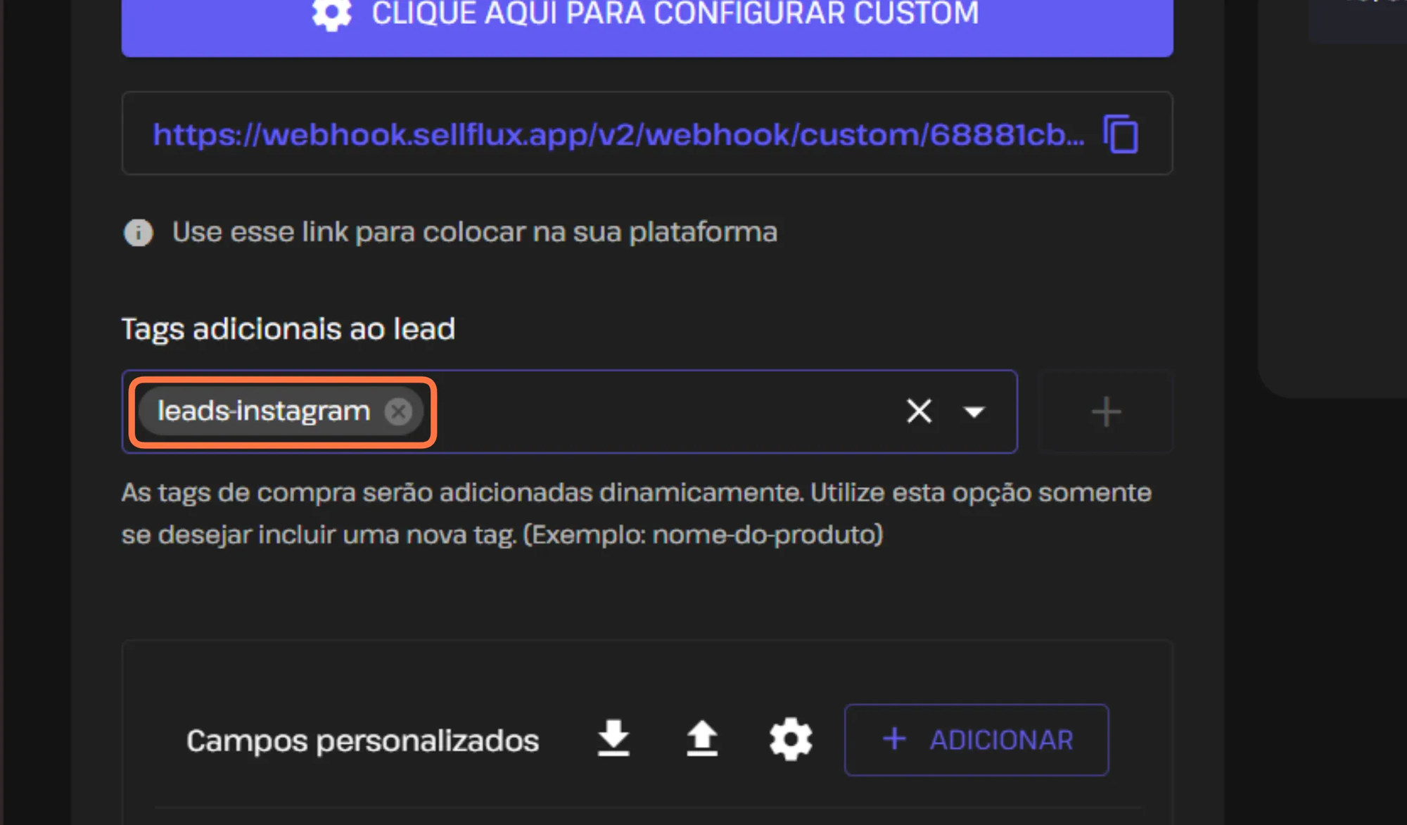 Ressalta-se que é possível criar e aplicar tags personalizadas aos leads que chegaram por meio deste Webhook, selecionando uma tag no campo “Tags adicionais ao lead”, a fim de identificar quais leads são originados do Instagram.