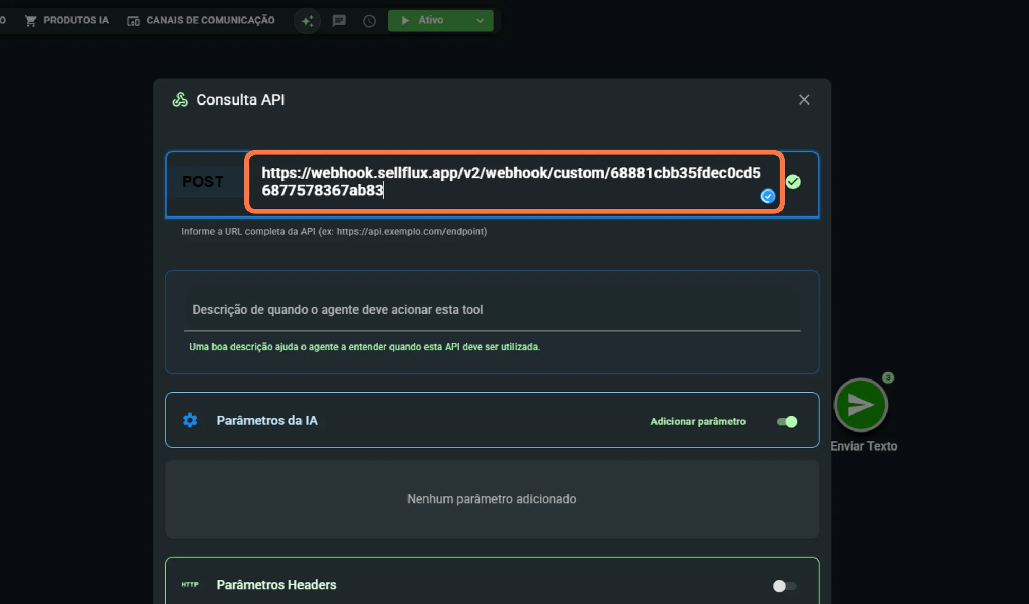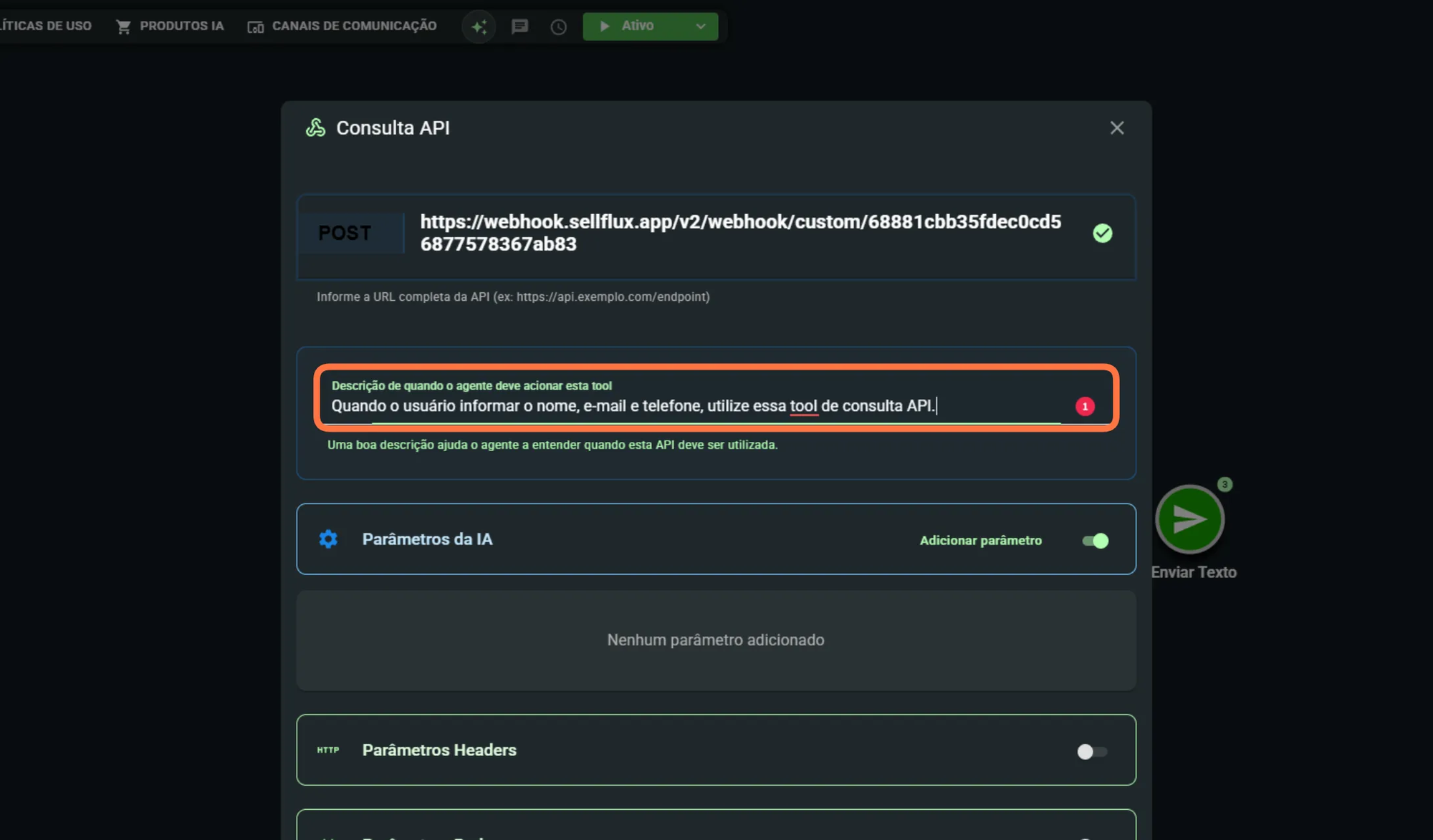 25- Nesta etapa, iremos descrever quando a IA deverá acessar a tool de Consulta API para realizar os envios de dados para o Webhook Custom.