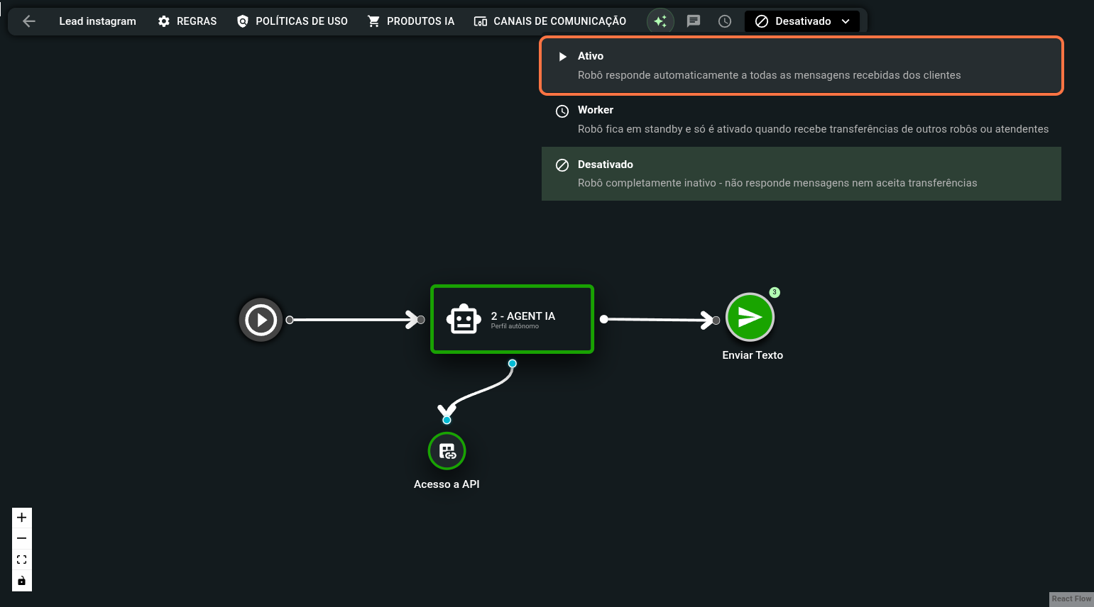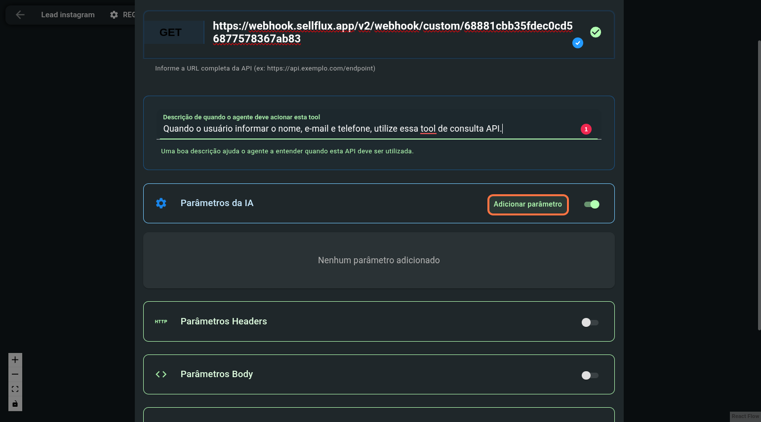 Com esse processo concluído, a configuração para geração de leads a partir do Direct do Instagram utilizando a SellFlux está finalizada. A partir desse momento, todas as mensagens recebidas no Direct passam a ser atendidas pelo agente de IA configurado, que coleta automaticamente os dados do lead e os envia para o Webhook Custom, garantindo o registro correto na SellFlux.