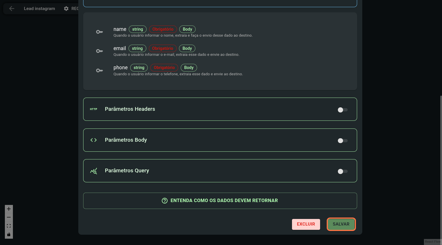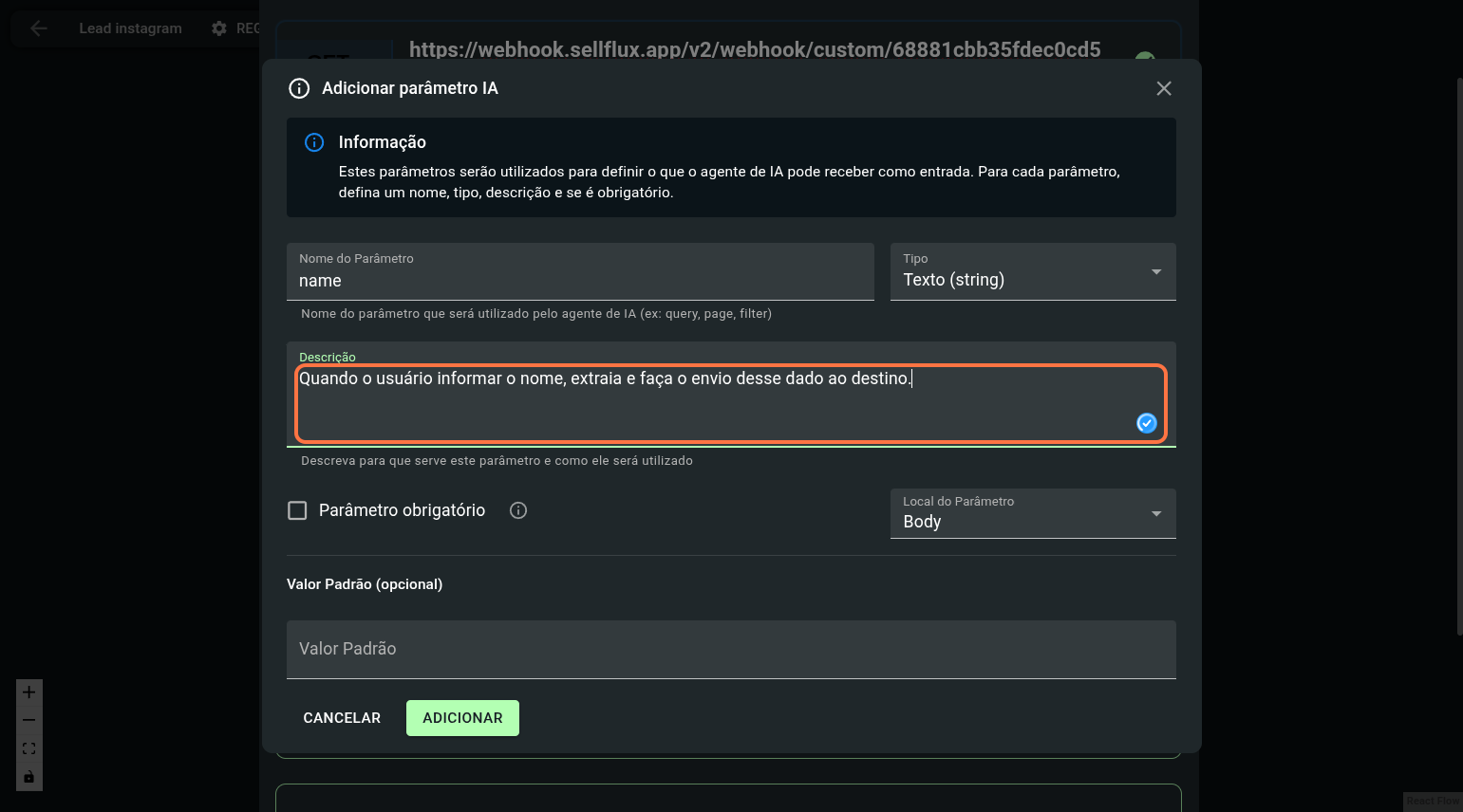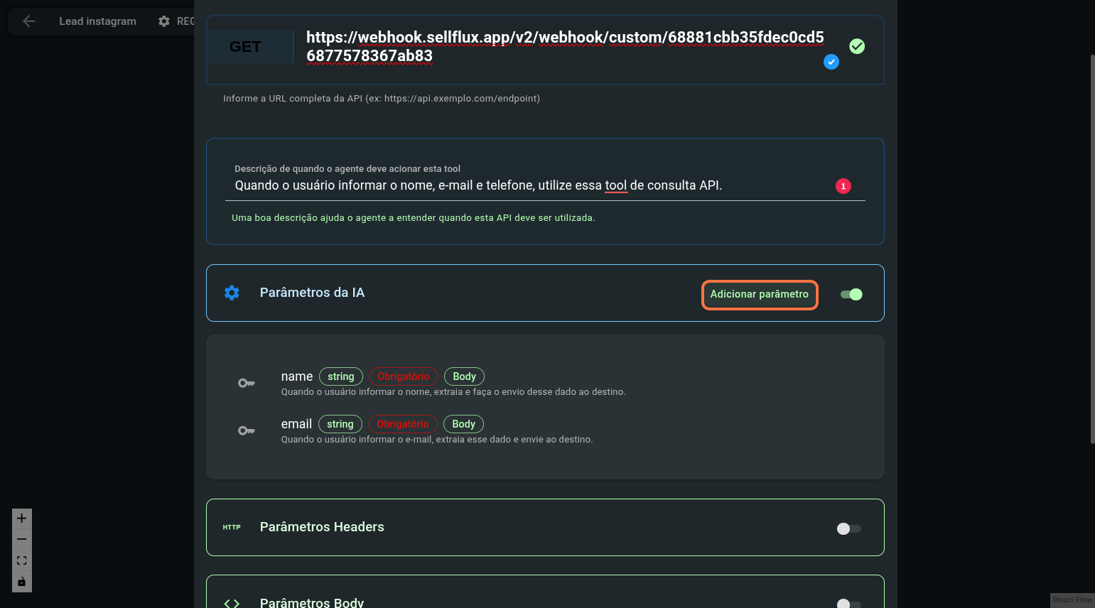 27- Agora, nomeie os parâmetros que serão enviados. Considerando as propriedades dos valores padrões aceitos no JSON recebido nos endpoints da Sellflux. O primeiro valor a ser adicionado será o "name", que é o parâmetro responsável por enviar o nome do lead.