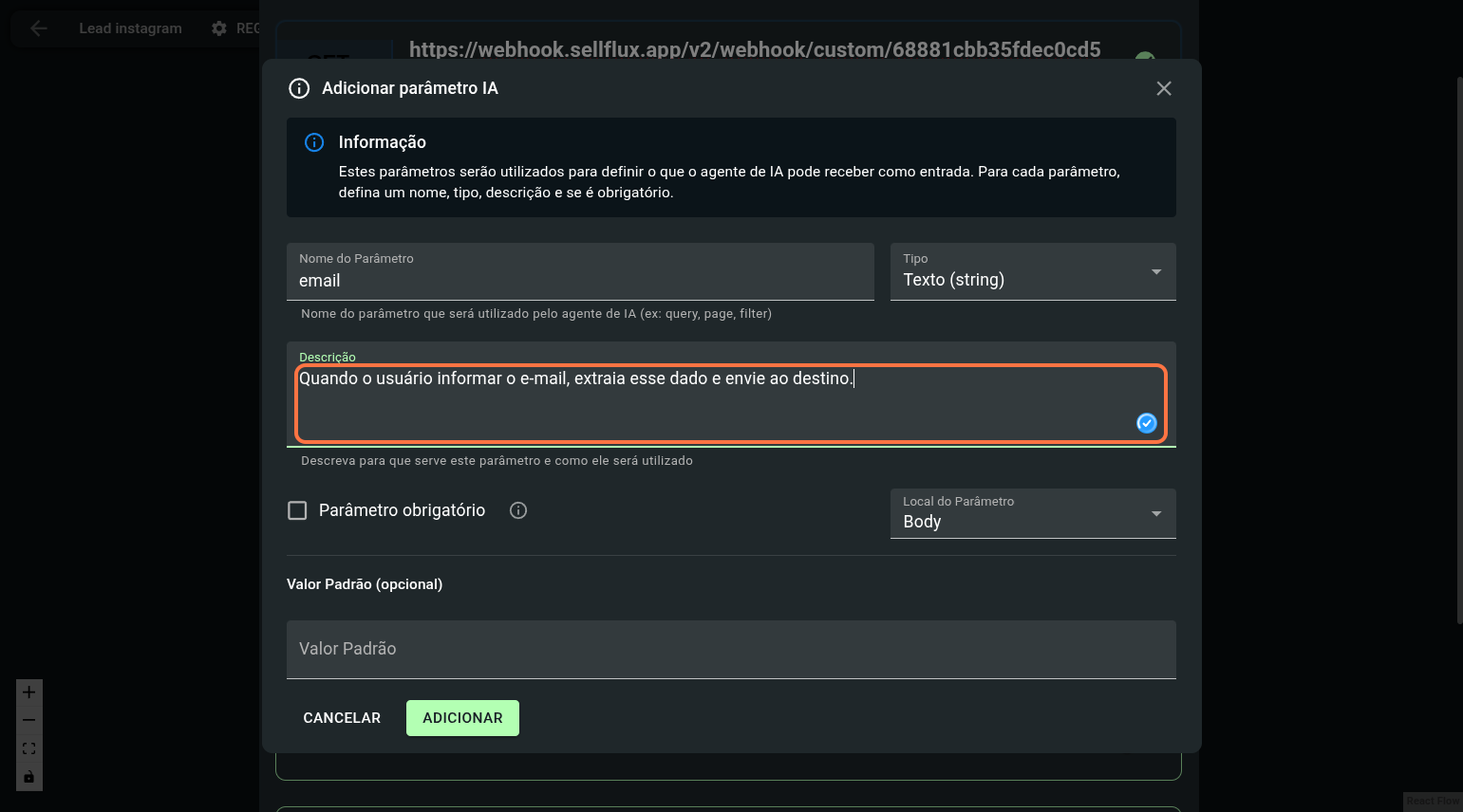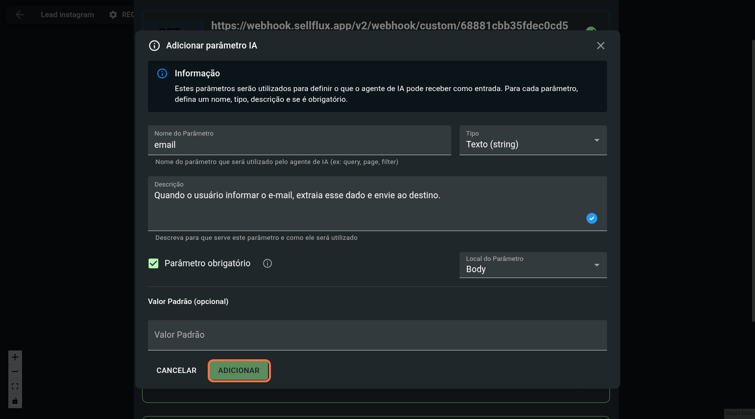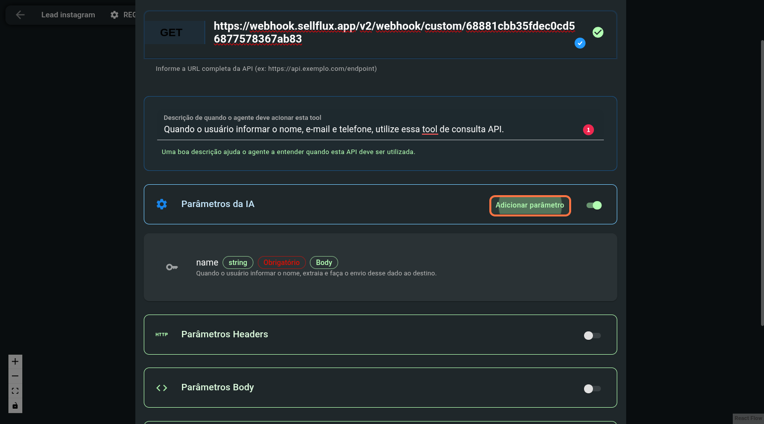 26- Mantenha a opção de "Parâmetros da IA" ativo, e clique em "Adicionar parâmetro".