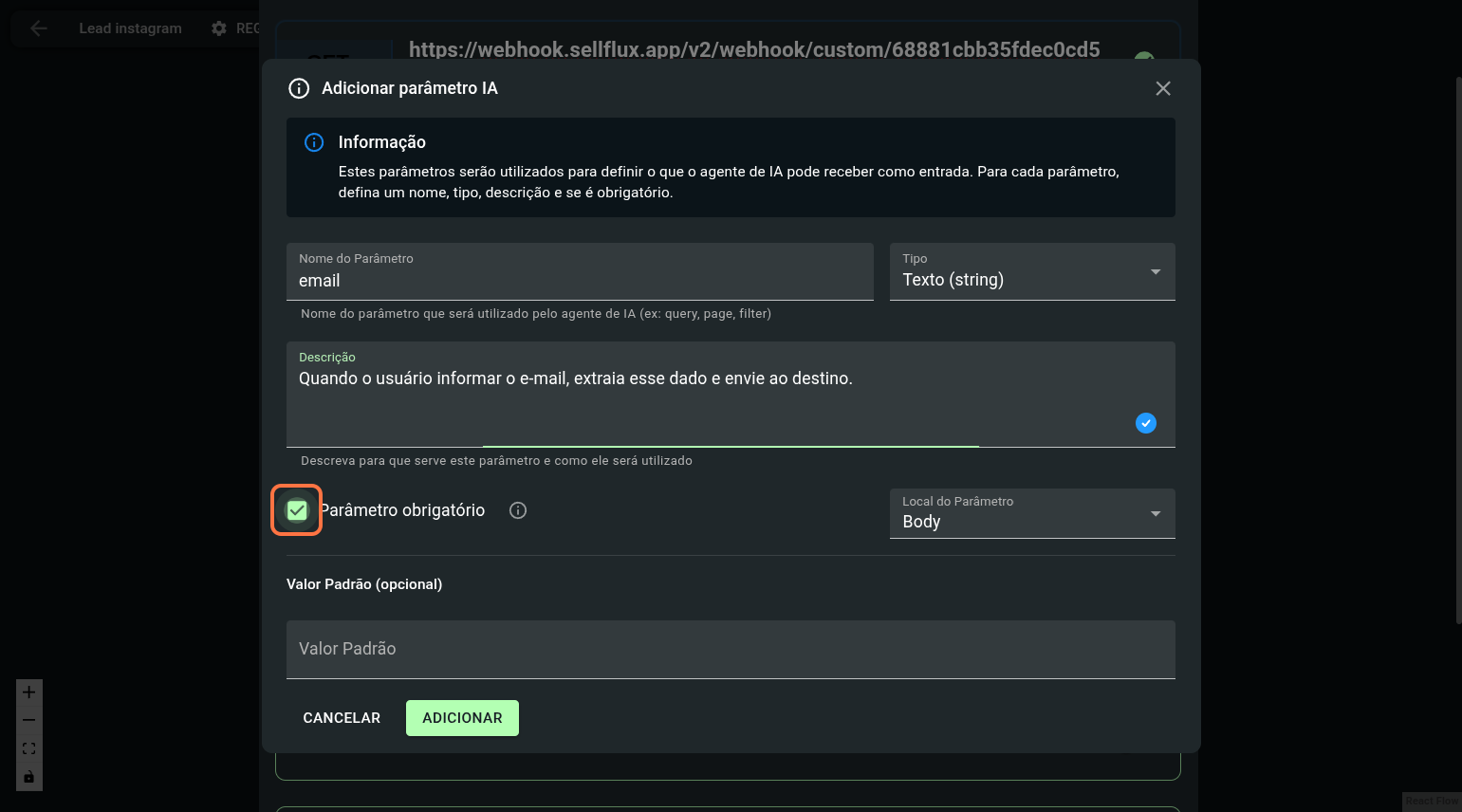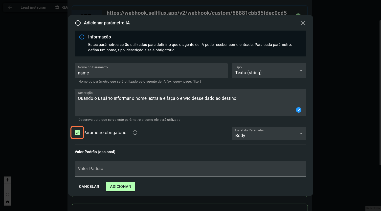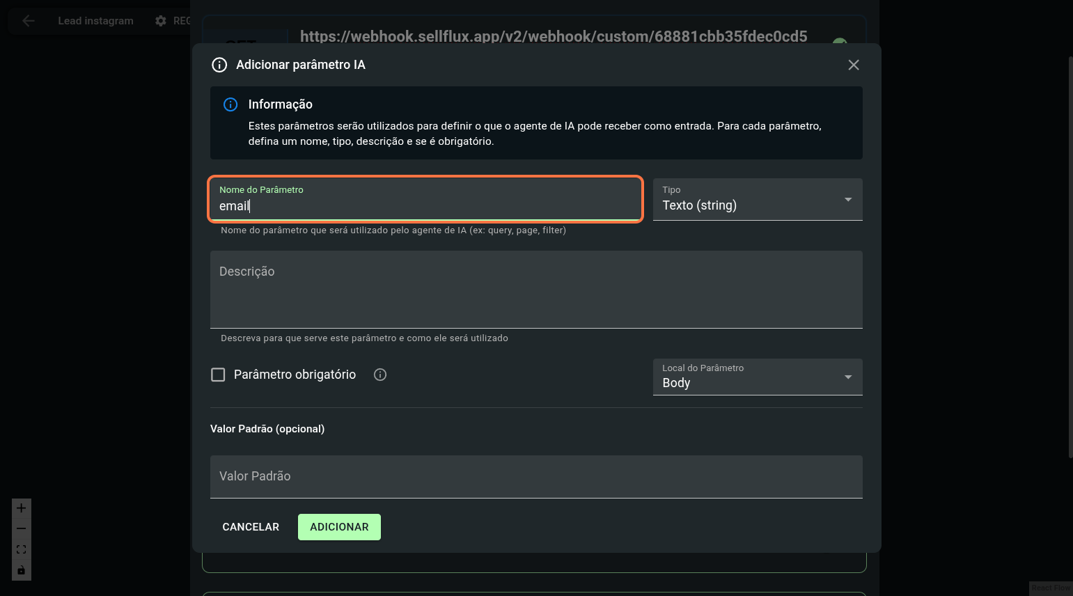 26- Mantenha a opção de "Parâmetros da IA" ativo, e clique em "Adicionar parâmetro".