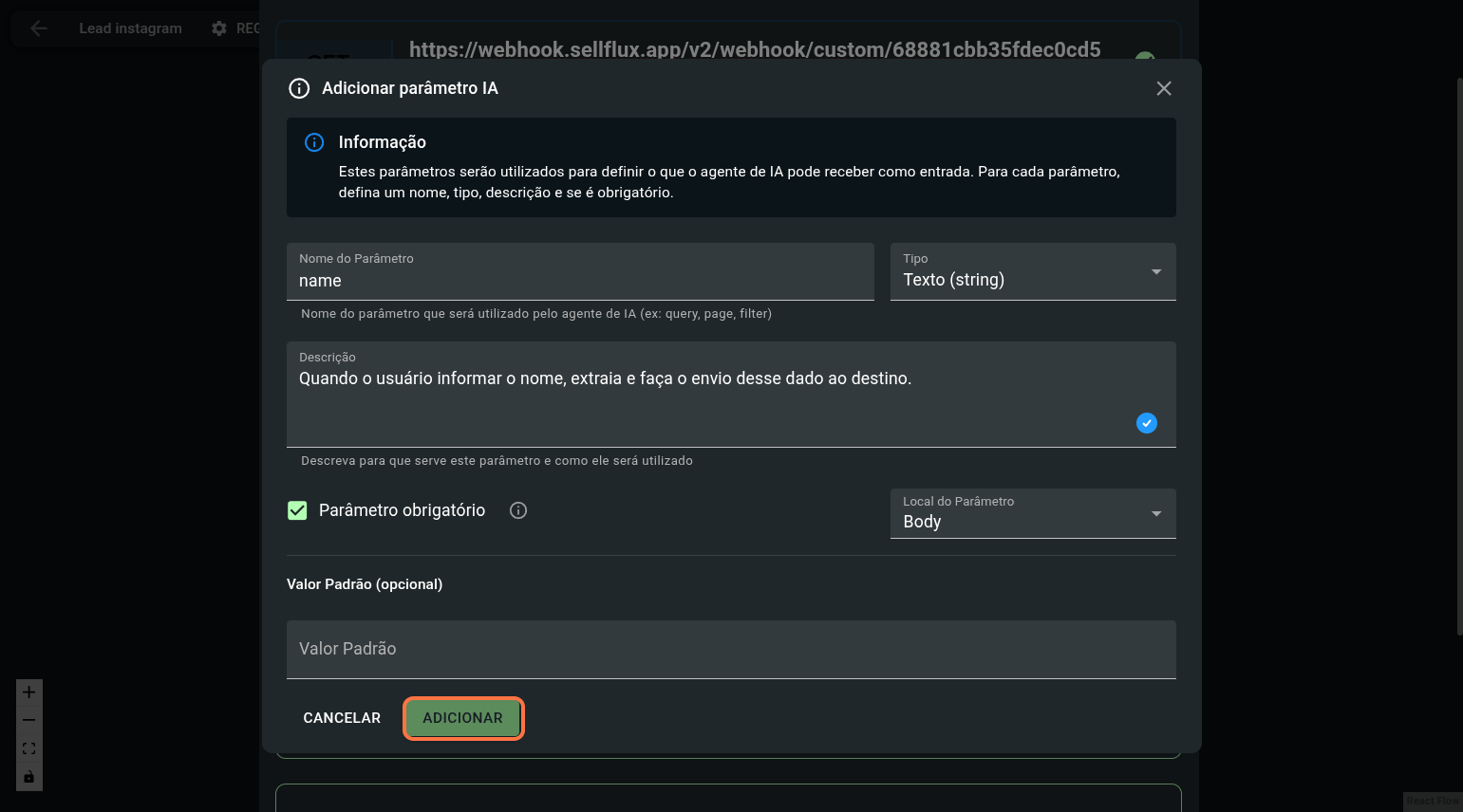 32- Agora, com tudo preenchido, basta clicar em adicionar para que o parâmetro seja adicionado e salvo.