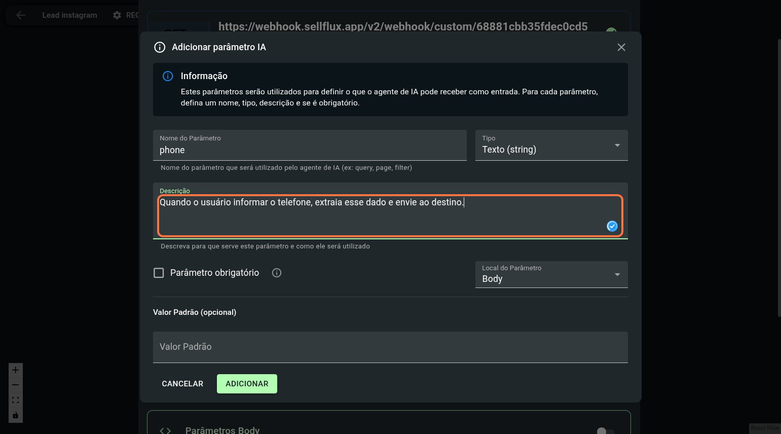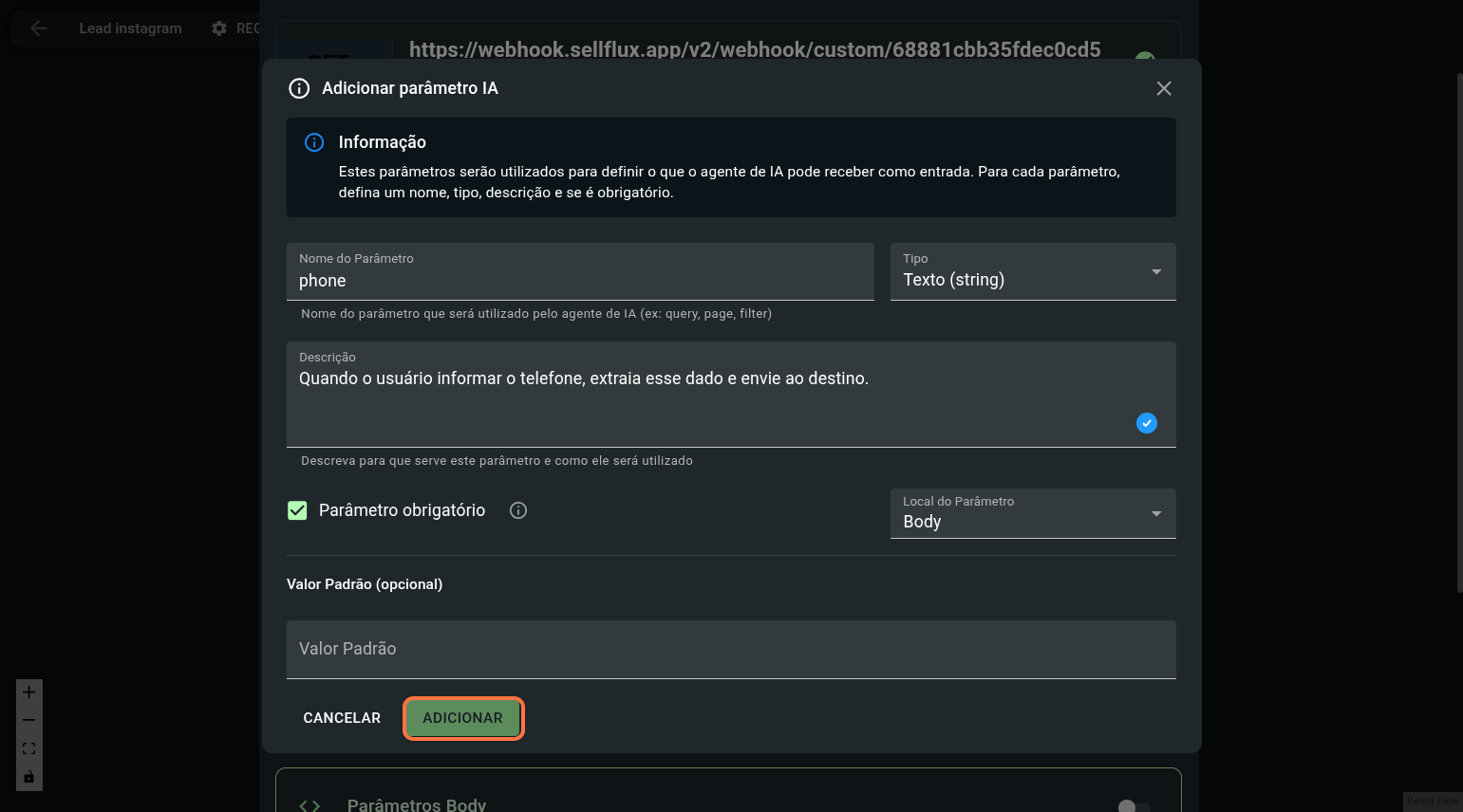 38- Clique em "adicionar parâmetro" para configurar o parâmetro final, de telefone.