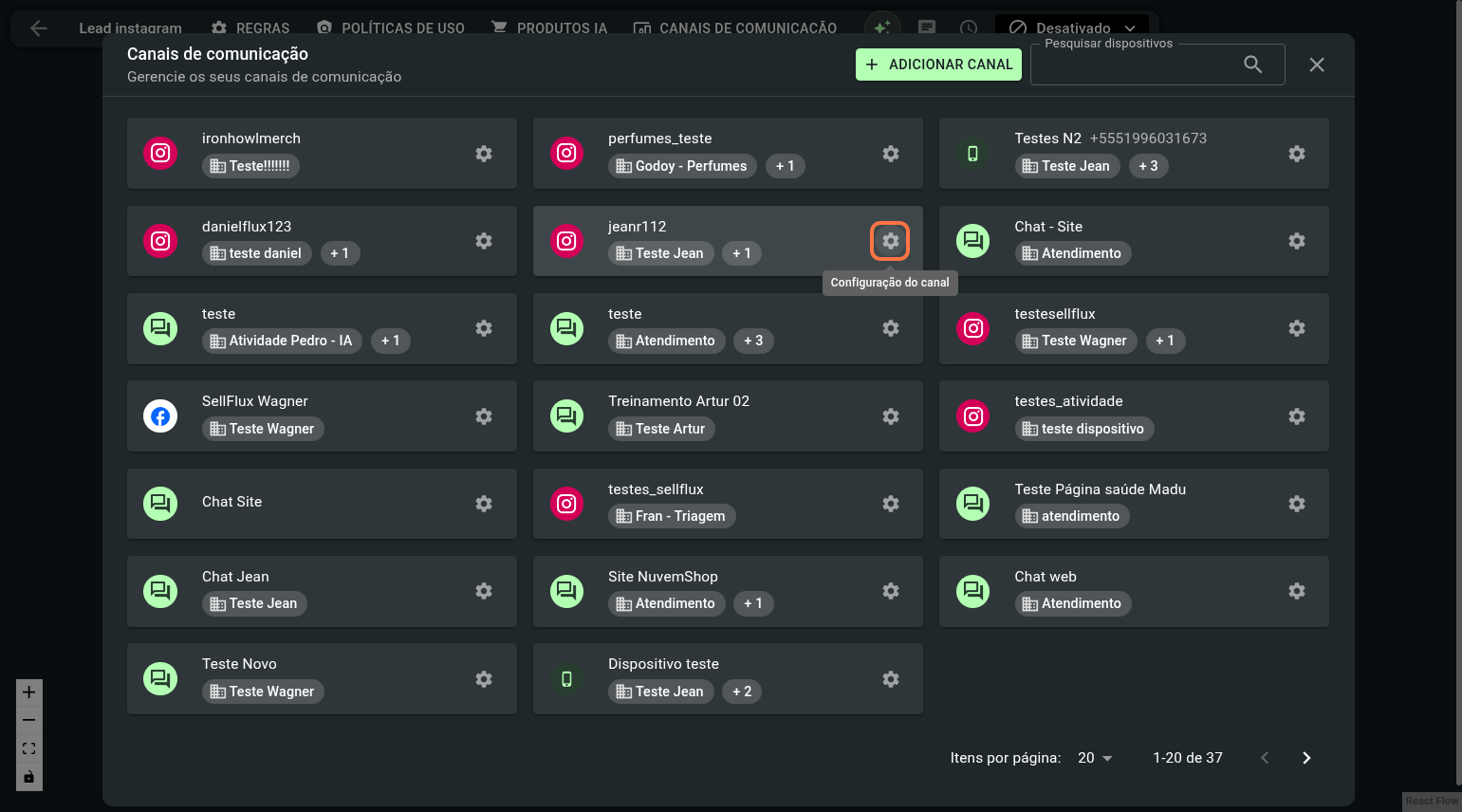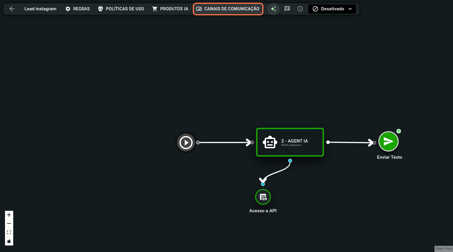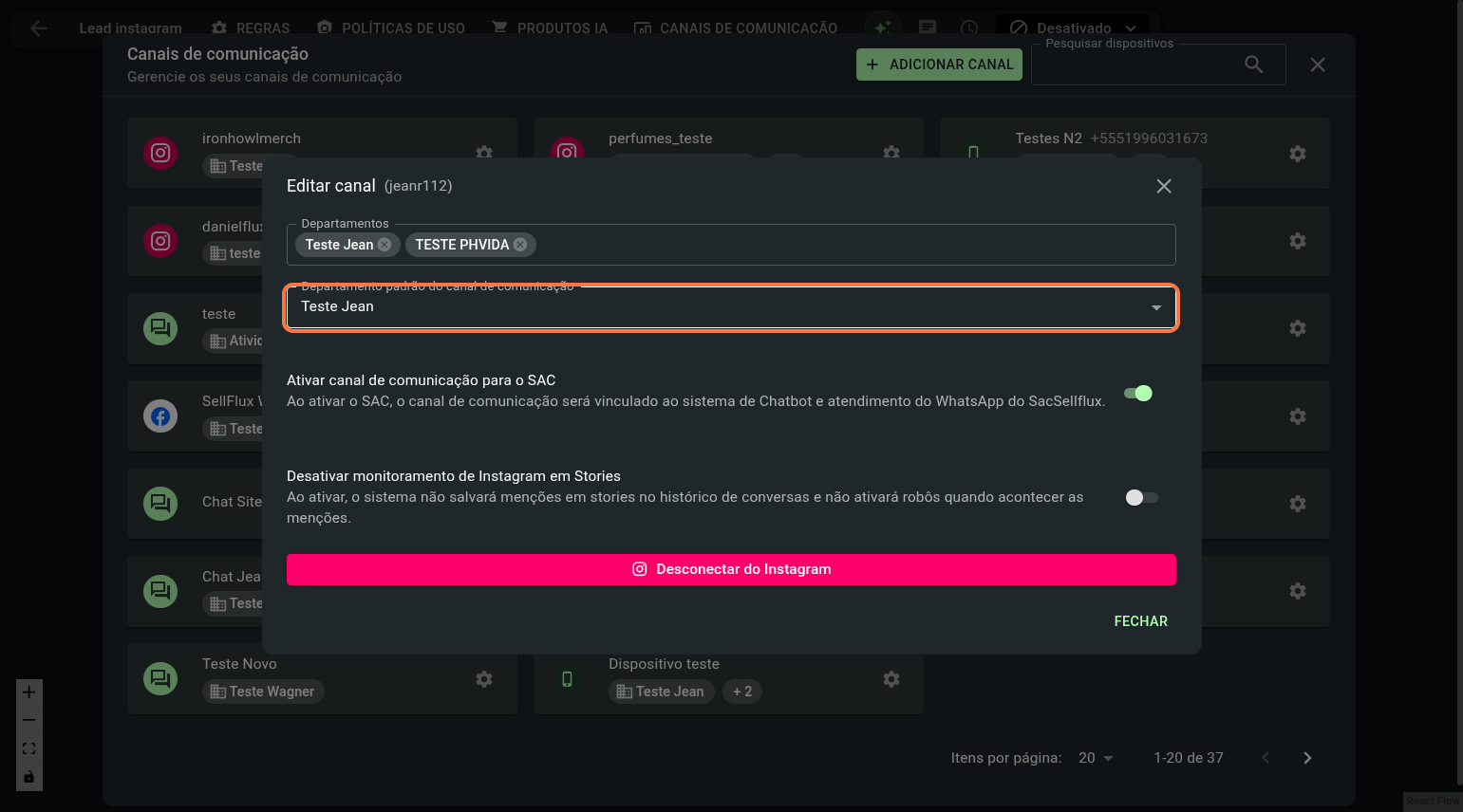 44- Para que o fluxo funcione na prática, é necessário verificar o departamento padrão ao qual está vinculada a conta do Instagram em que o agente de atendimento será aplicado. Para isso, acesse a opção “Canais de comunicação”.