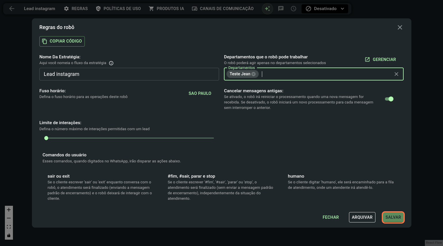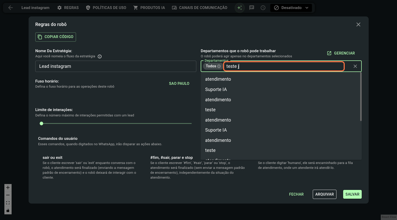 48- Em seguida, deve-se marcar o departamento padrão do canal de comunicação do Instagram como o departamento no qual a IA irá atuar.