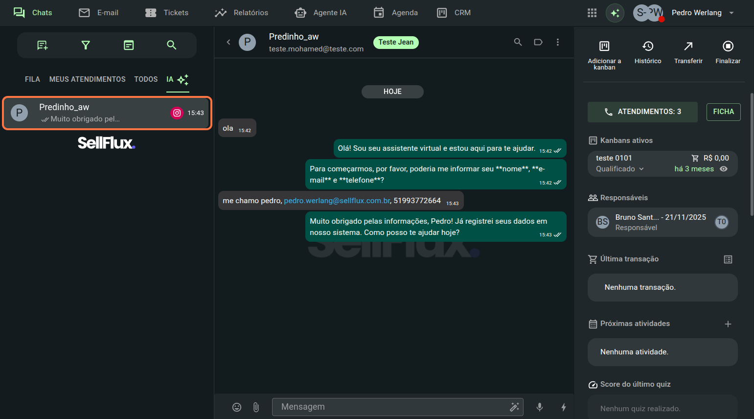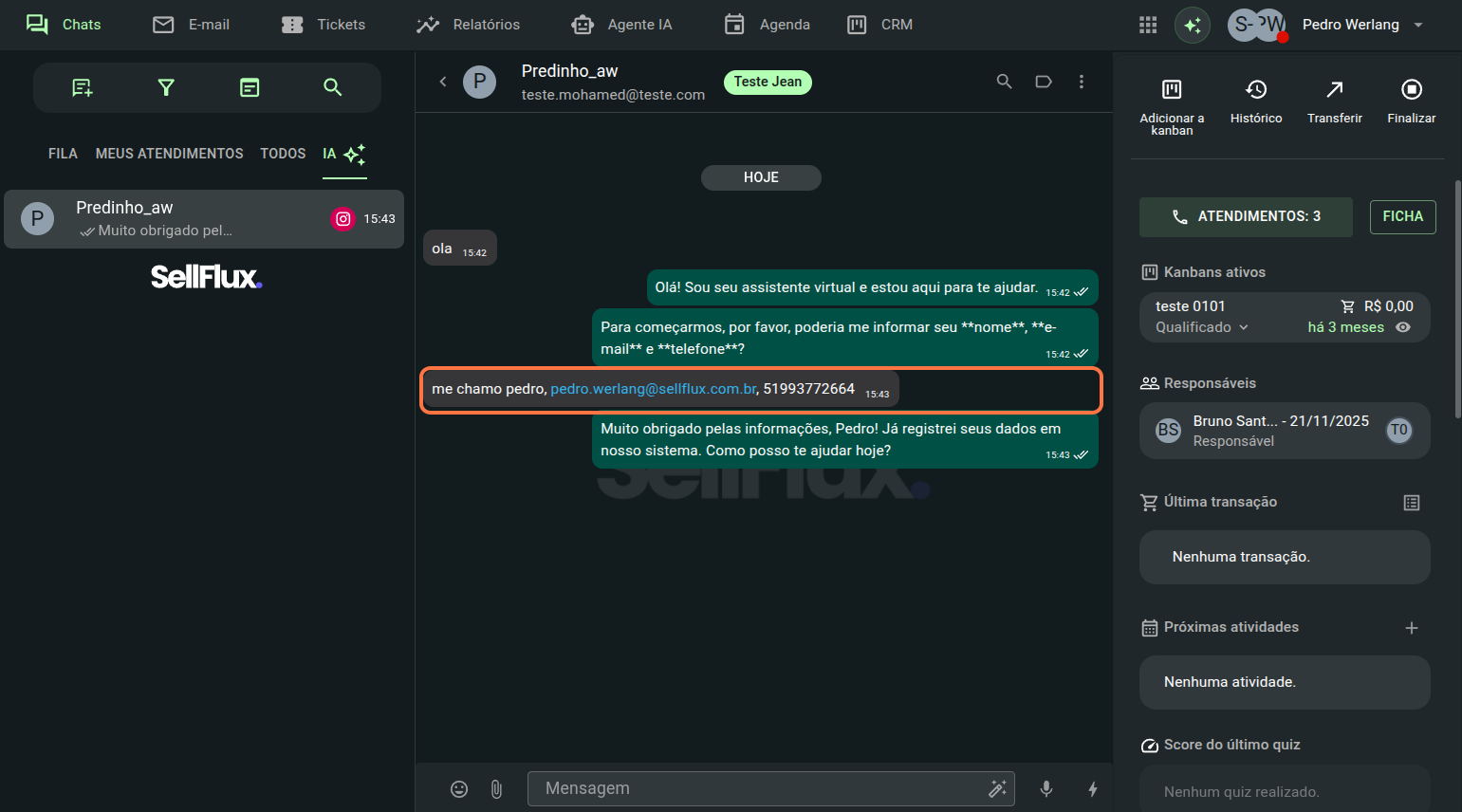 Aqui está um atendimento com a IA ativa, no qual o lead informou os dados de nome, e-mail e telefone, conforme a solicitação da IA.
