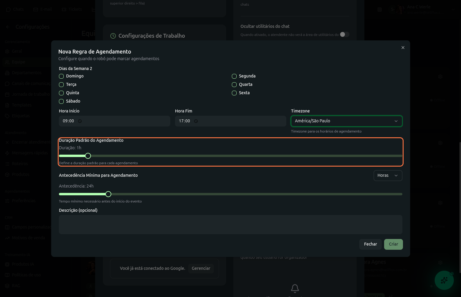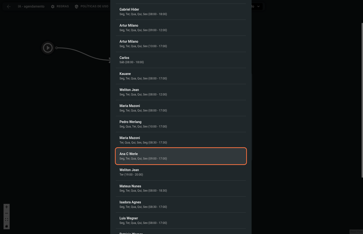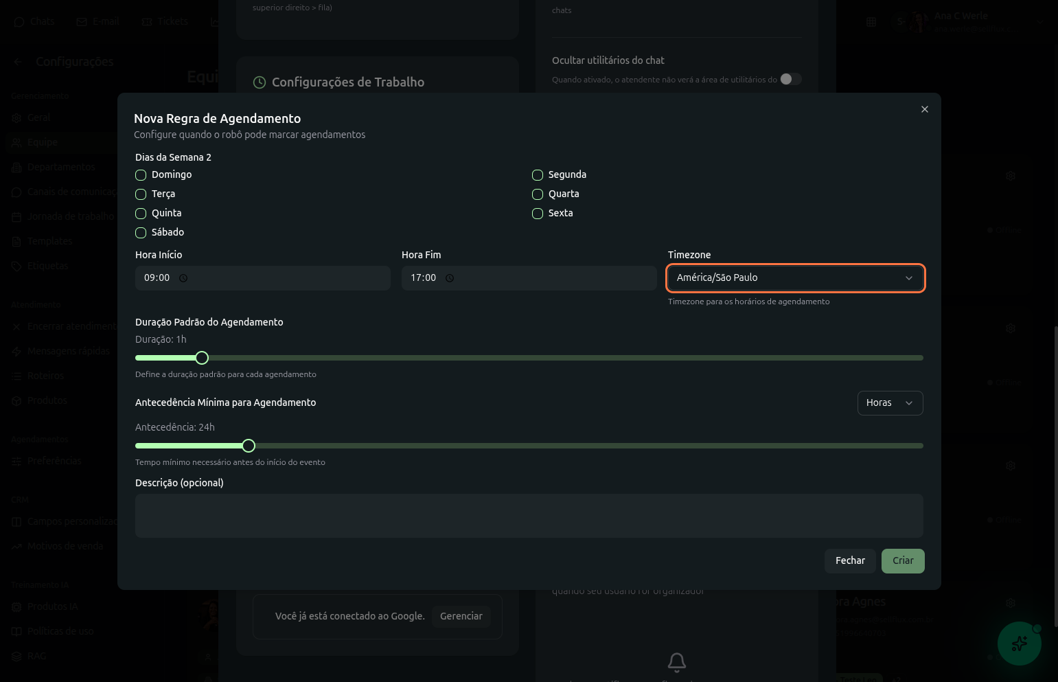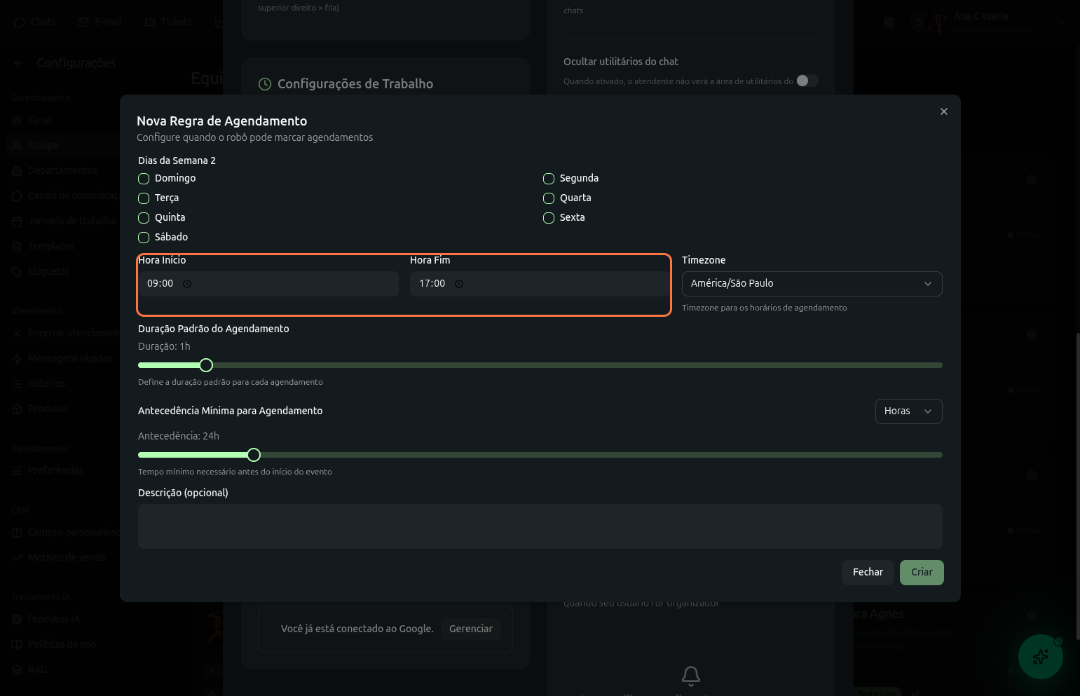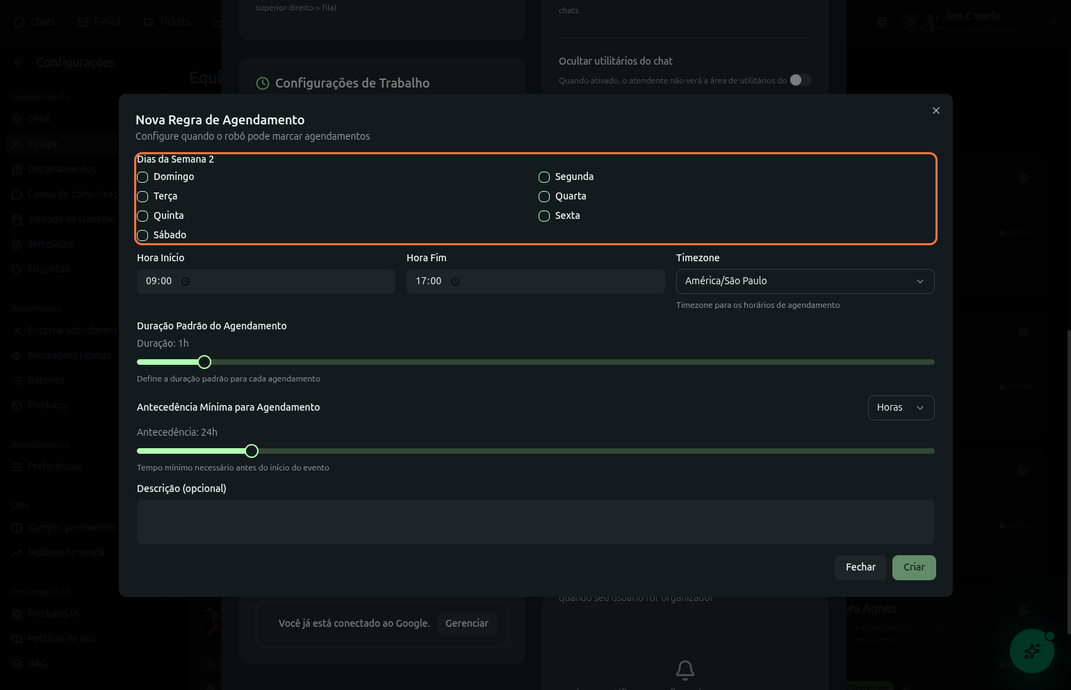 11. Agora, selecione os dias da semana em que será possível que a IA realize novos agendamentos para o seu usuário.