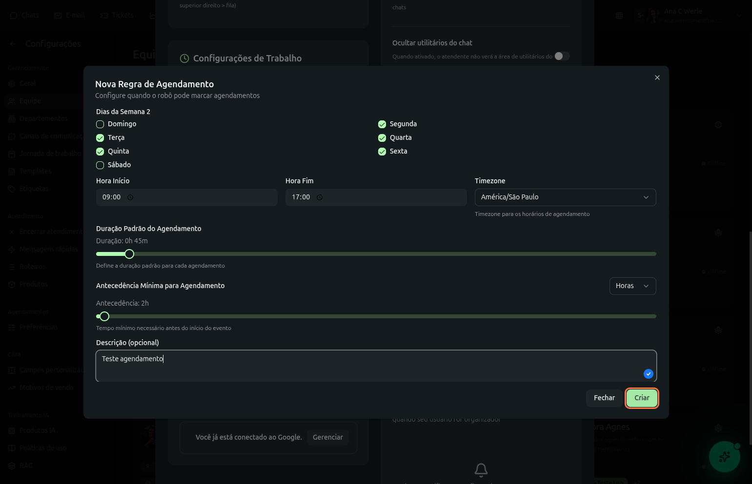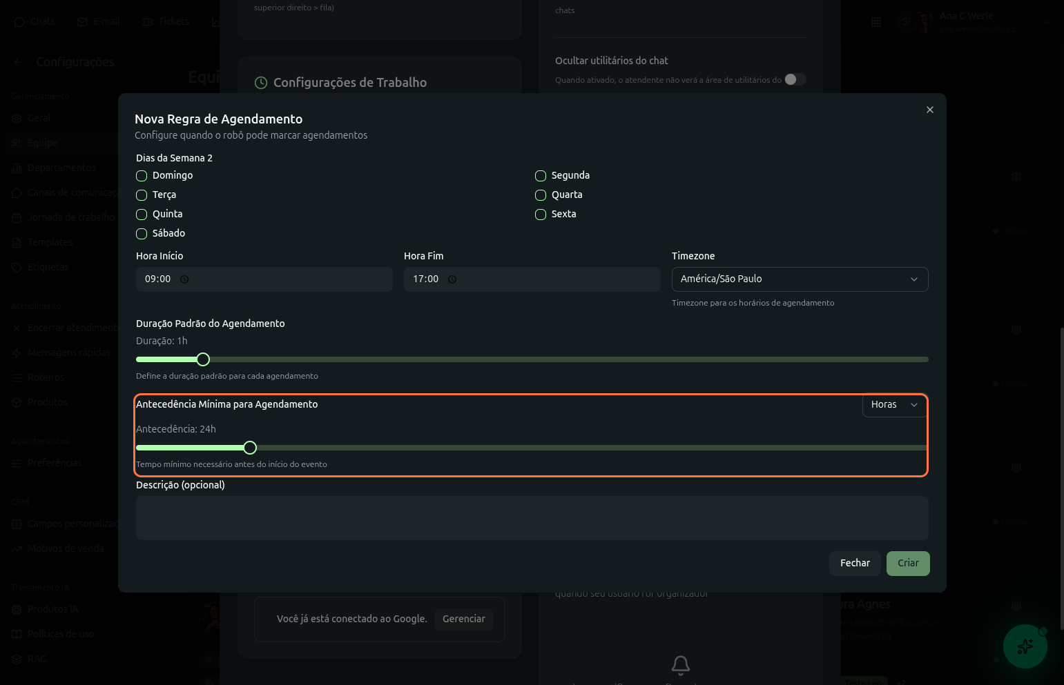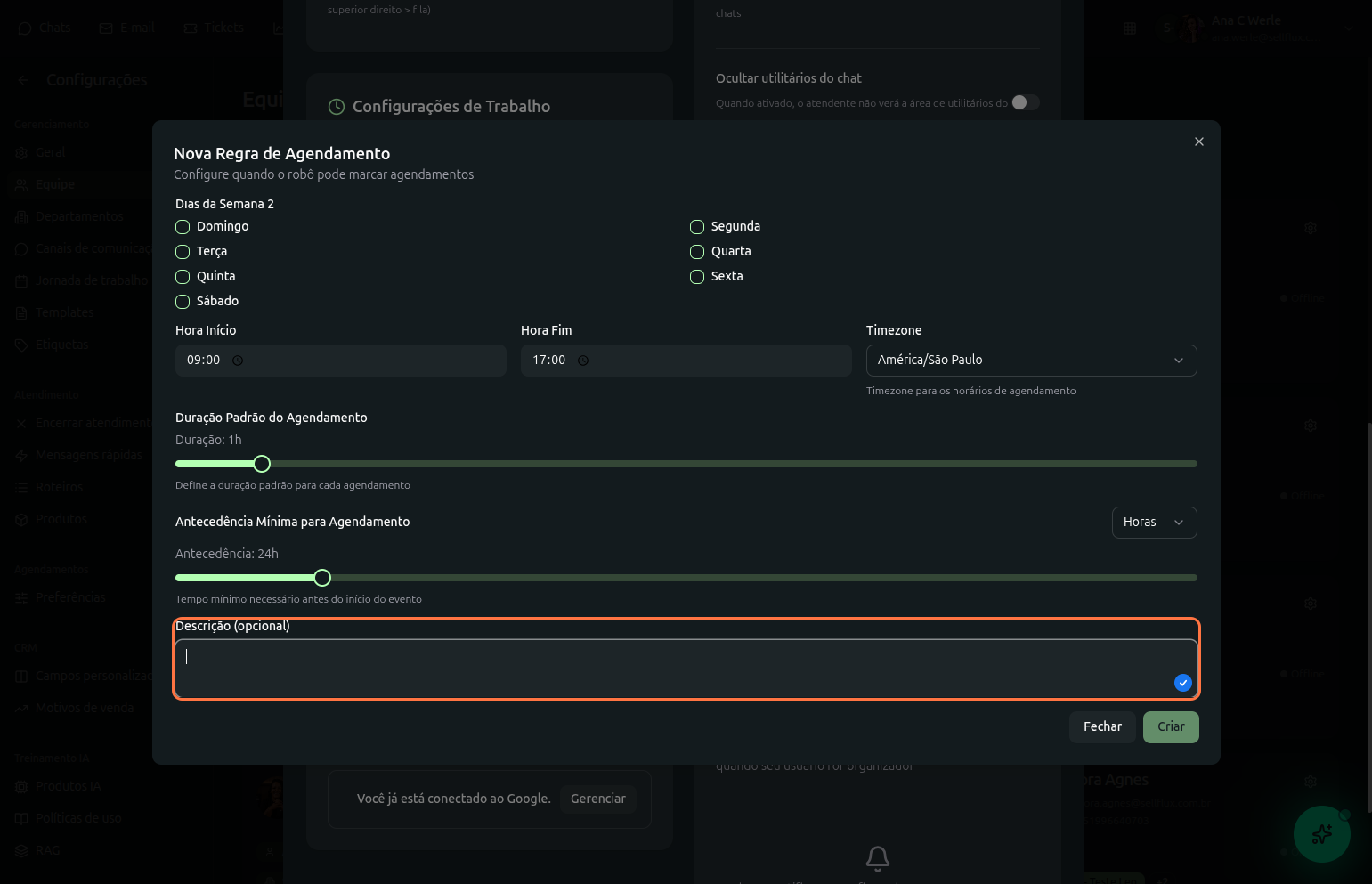Neste artigo, você aprenderá como configurar as regras de agendamento no SAC para que a IA realize agendamentos automáticos de forma inteligente e integrada à sua Google Agenda.