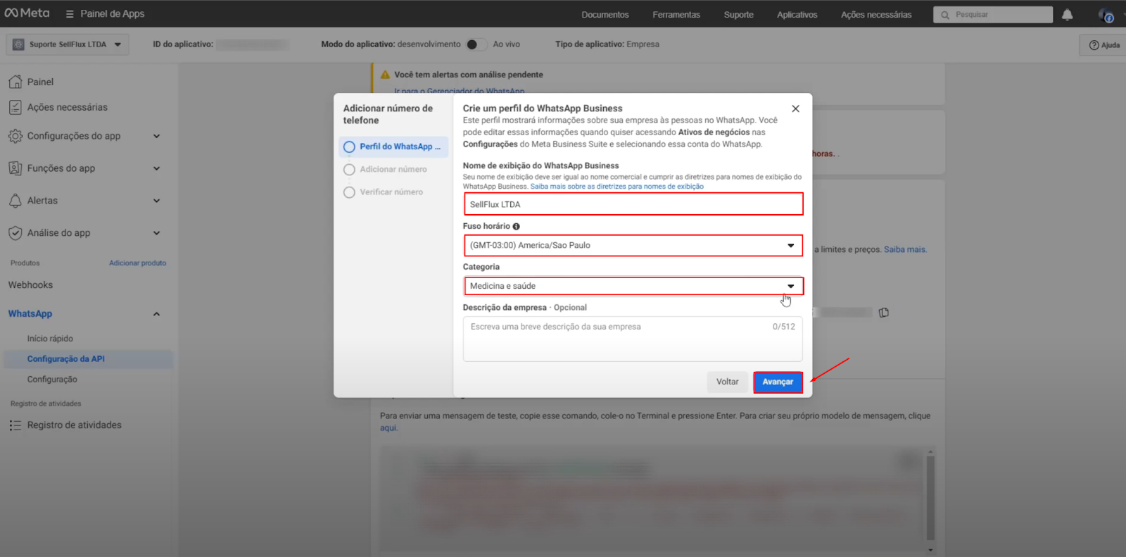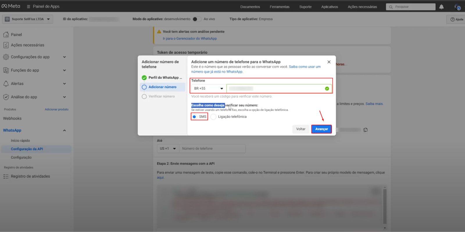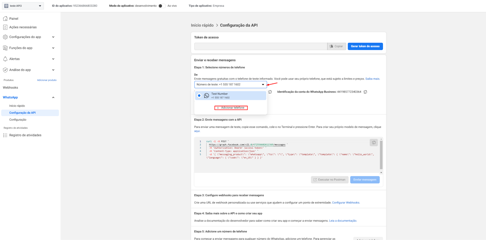 E neste campo, adicione o número de telefone a ser utilizado na API.