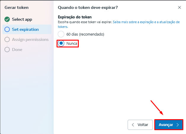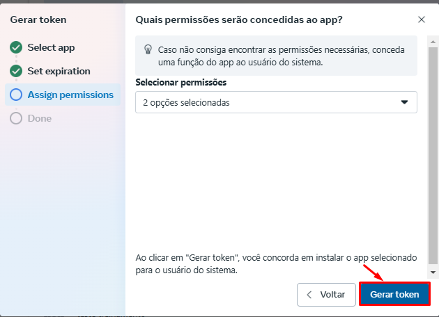 O token permanente é o que foi criado no passo 4. Token permanente, desse artigo.