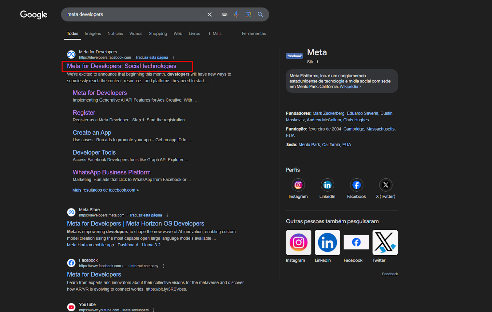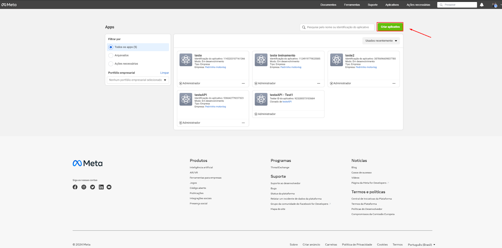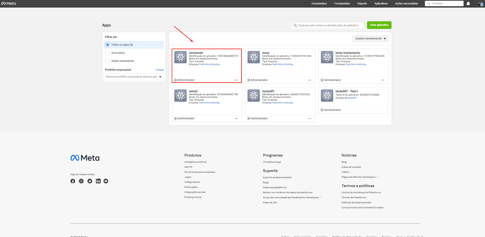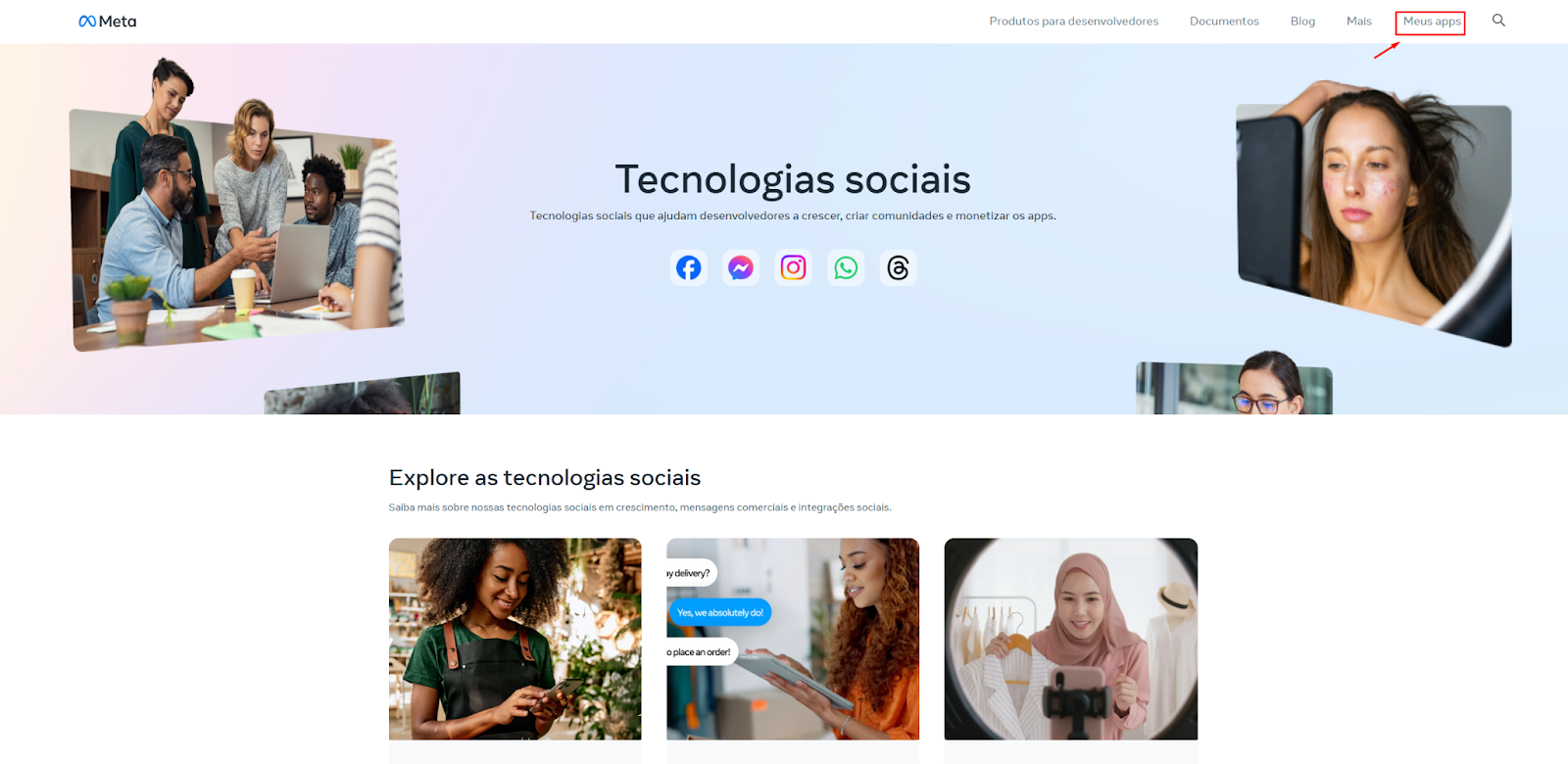 Após ter acessado o Meta Developers, vá em “Meus Apps”.