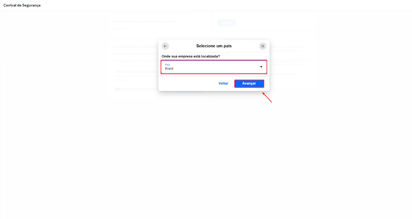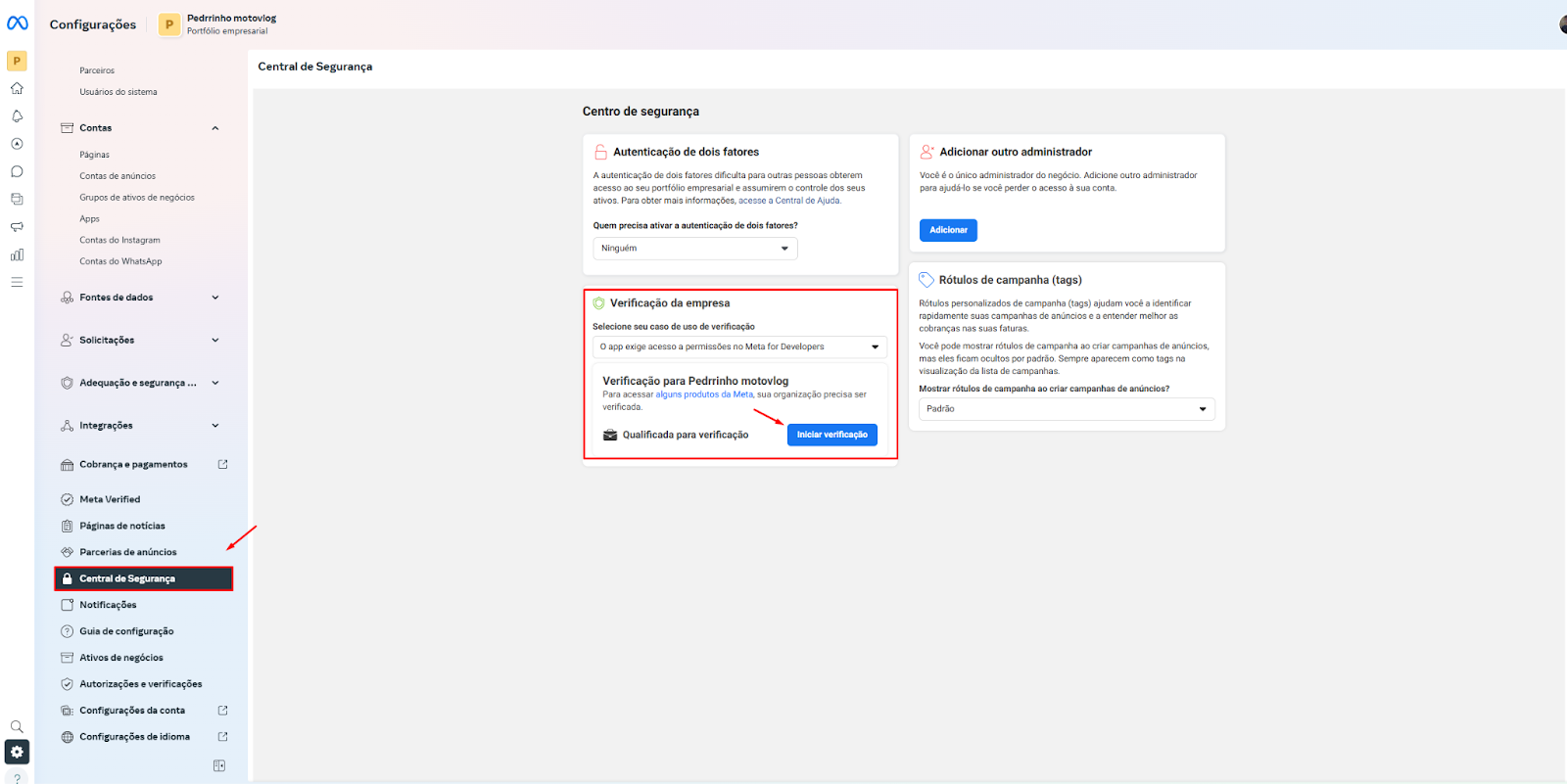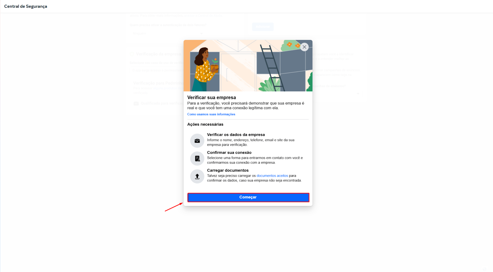 Feito isso, acesse a Central de Segurança e inicie a verificação da sua empresa.