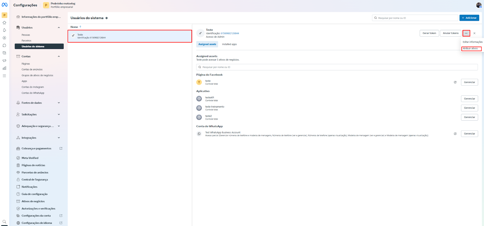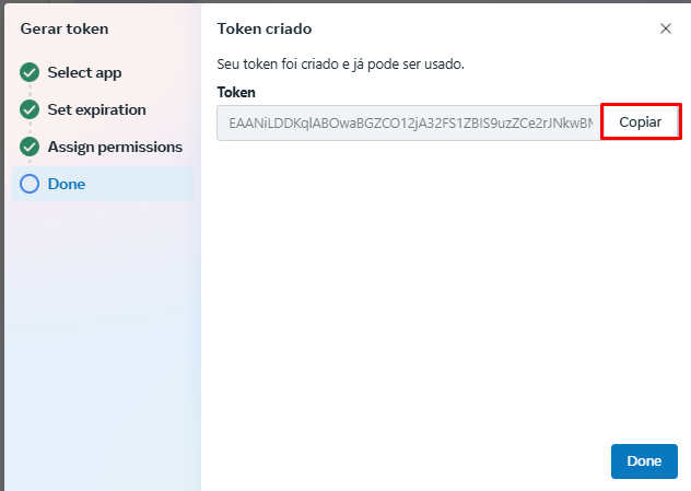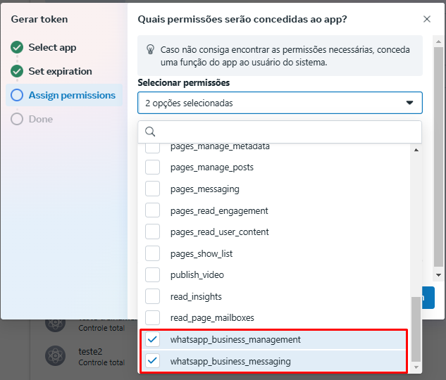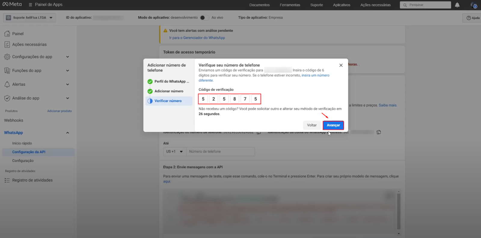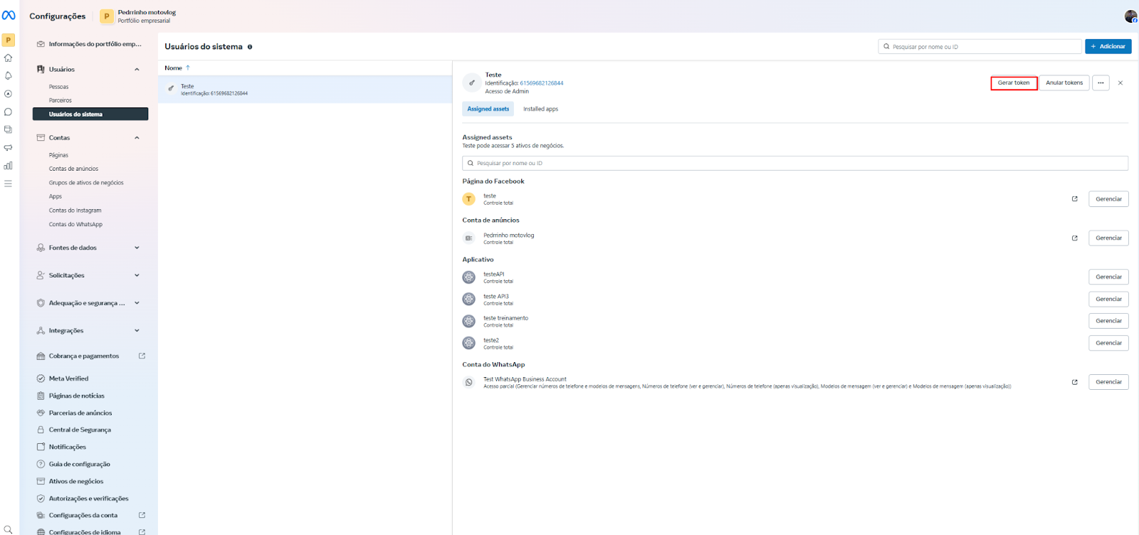 Após configurar o número de telefone, é necessário gerar o Token permanente.