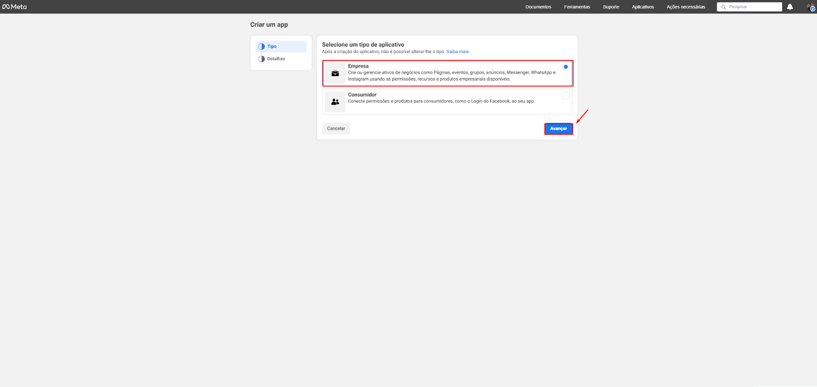 No tipo de aplicativo, deverá selecionar a opção “Empresa”.