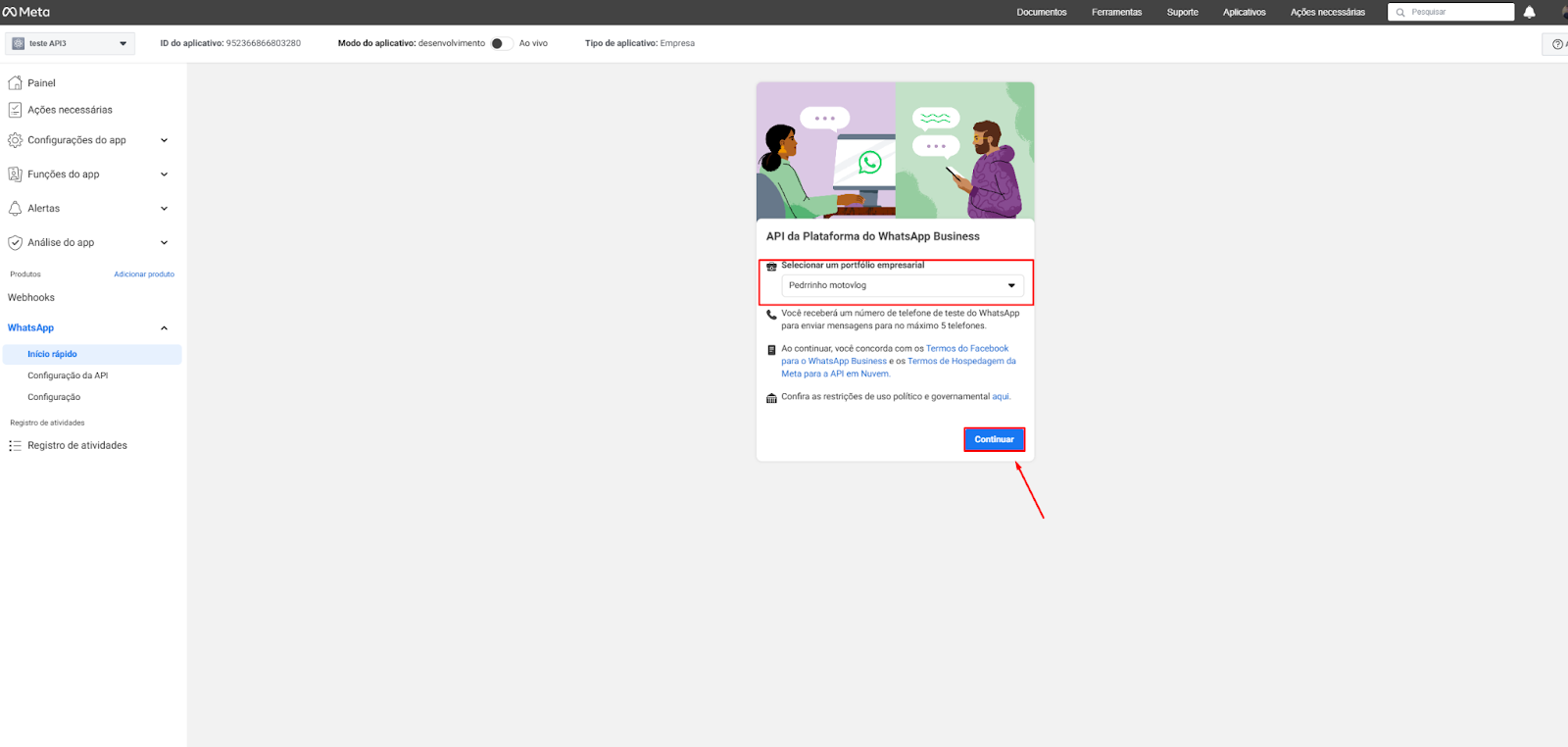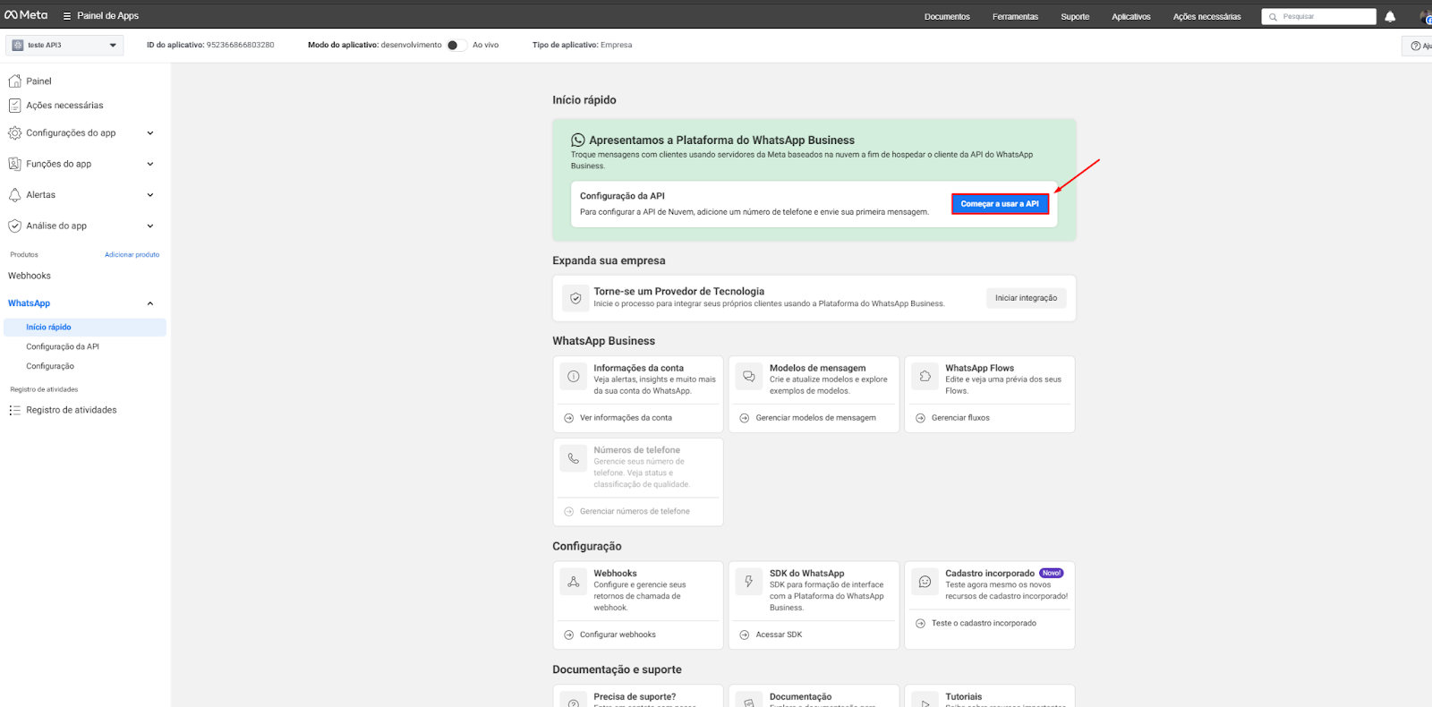 No Meta for Developers vá para opção “Whatsapp” no menu lateral, clique em "configuração".