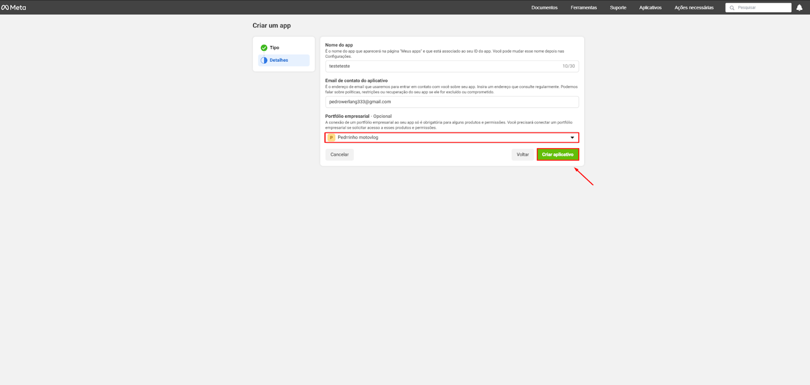 Nesta etapa, confirme o nome do App, o e-mail e seleciona a qual portifólio empresarial irá vincular este App.