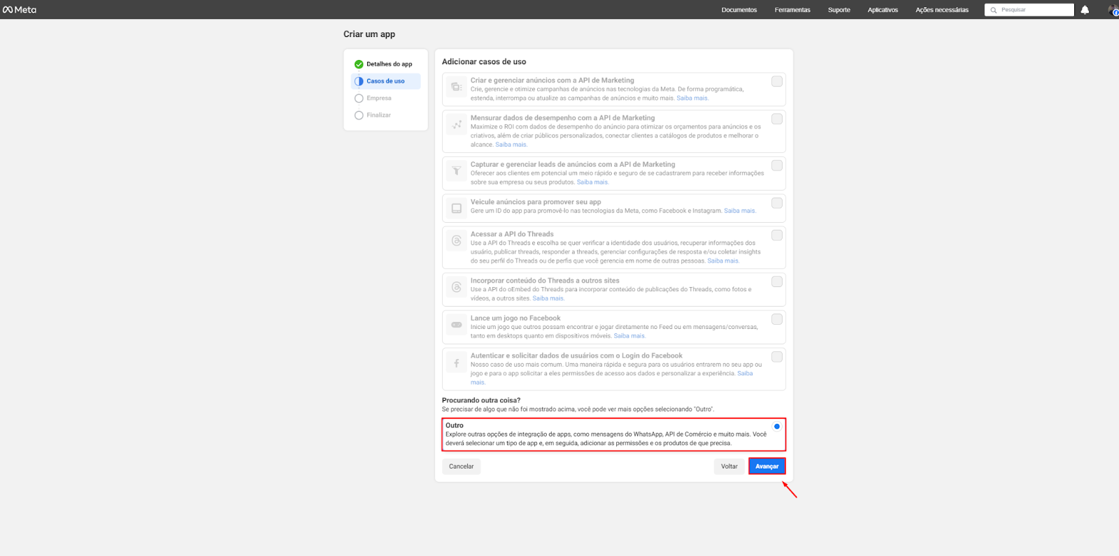 Entre no painel do Facebook e selecione sua API. Após isso, selecione "próximo".
