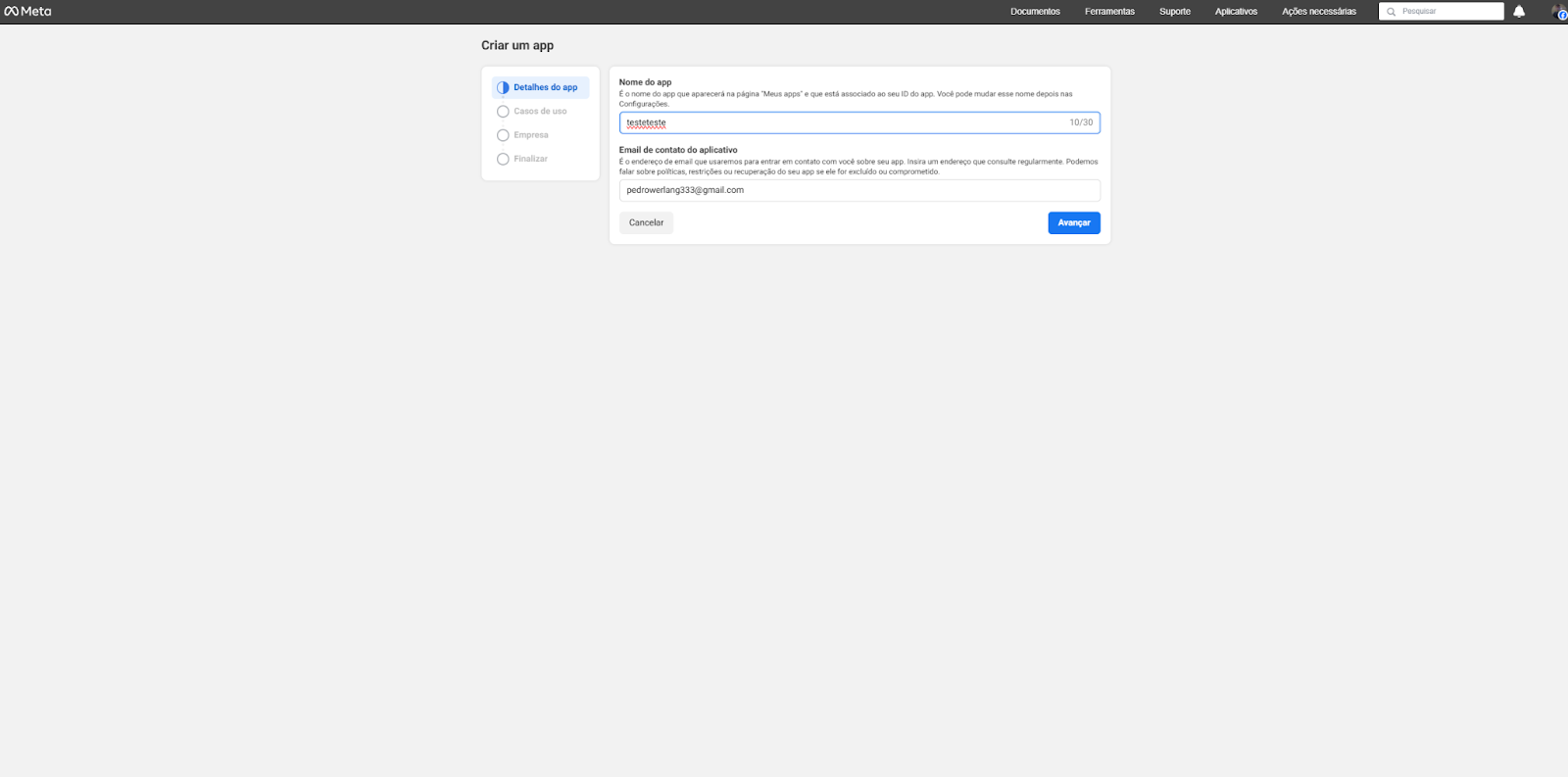 Agora, adicione um nome ao App, e vincule um e-mail, de sua preferência, a ele.