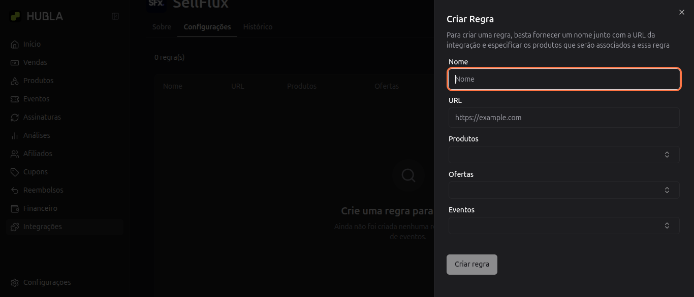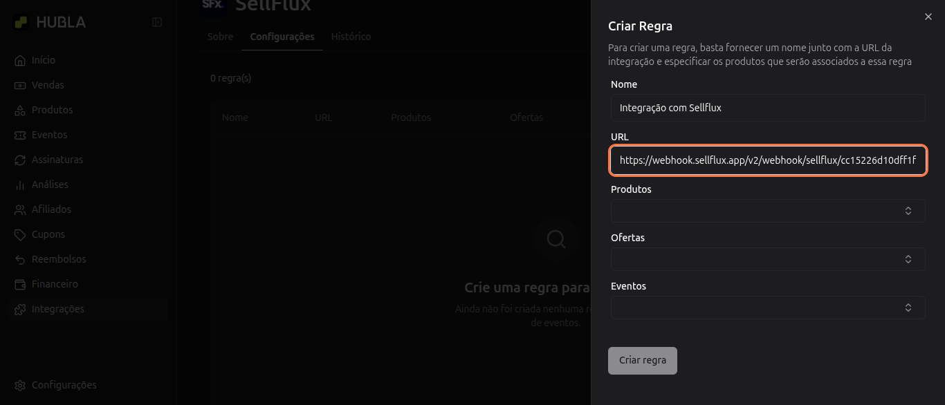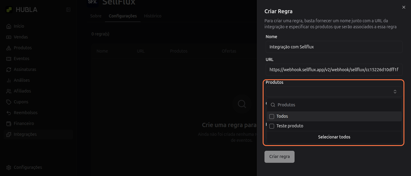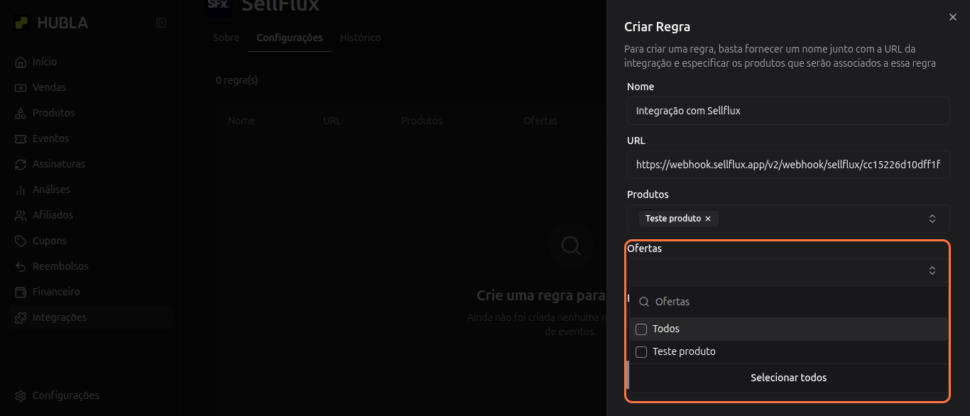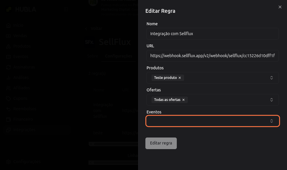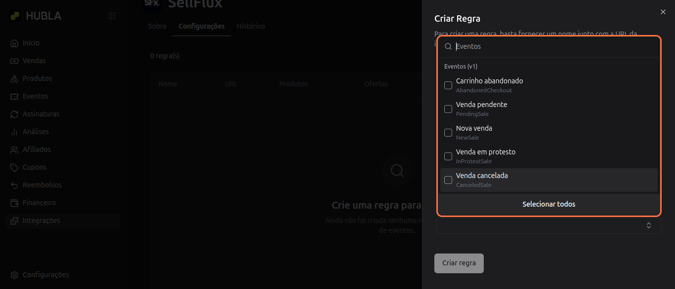 14- No campo evento, selecione os eventos que deseja enviar através dessa integração para o Sellflux.