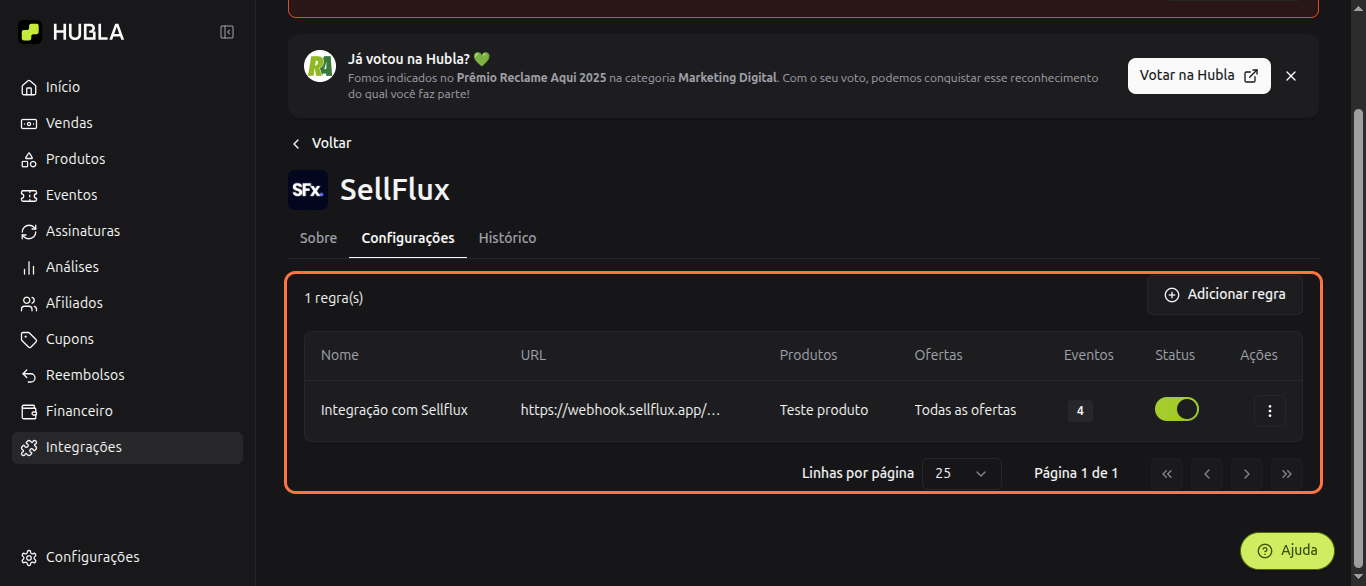 Integração concluída! 🚀 Agora, o SellFlux e a Hubla estão conectados, permitindo que todos os eventos configurados sejam enviados automaticamente para sua conta. Com isso, você poderá acompanhar as ações dos seus alunos em tempo real e acionar comunicações automáticas de forma inteligente. Essa conexão garante mais agilidade, organização e personalização no relacionamento com seus clientes e alunos.