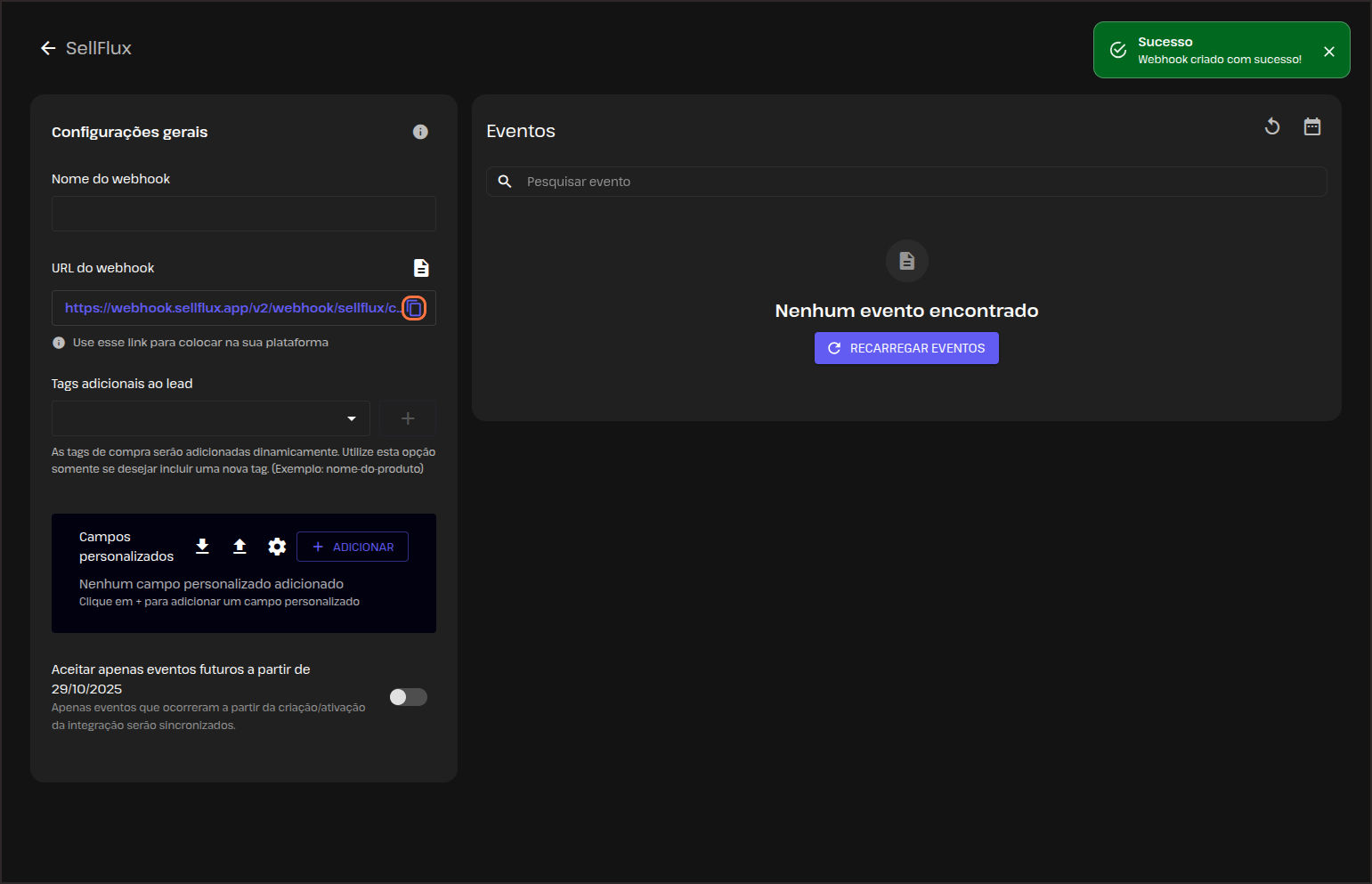 11- Cole o URL do webhook copiado na plataforma Sellflux no campo indicado.