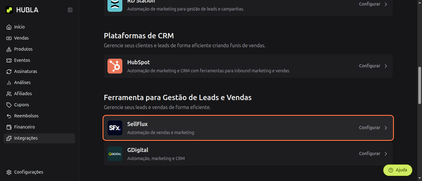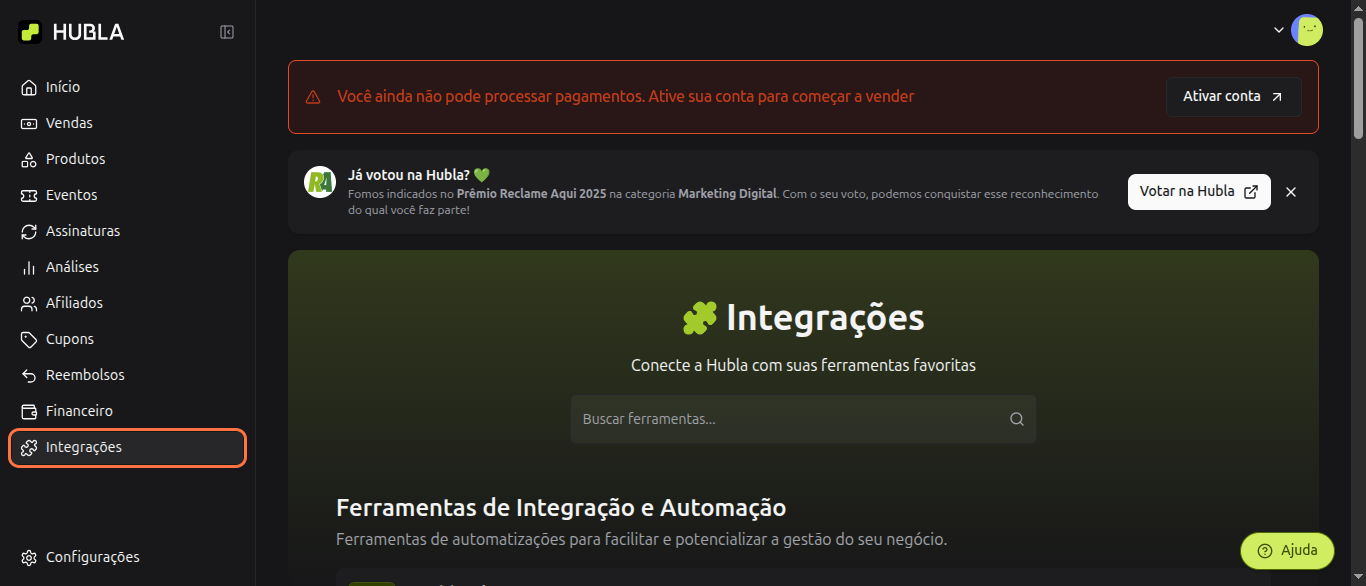 6- Acesse a plataforma Hubla e clique na opção "Integrações".