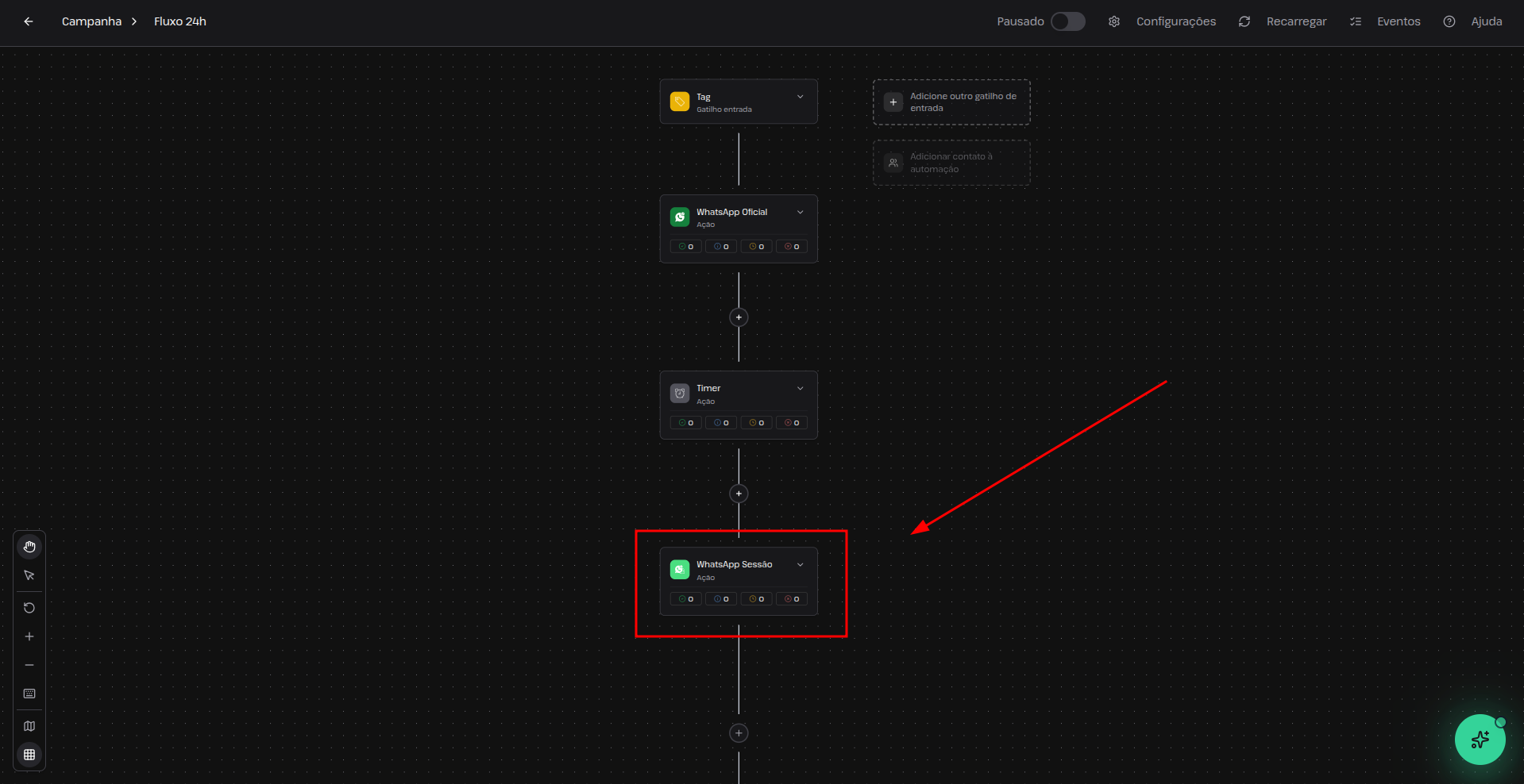 É possível adicionar múltiplas stages de “WhatsApp para sessão aberta” na automação. Essa estratégia estimula o engajamento do cliente, pois a cada interação realizada pelo lead a janela de 24 horas é renovada.