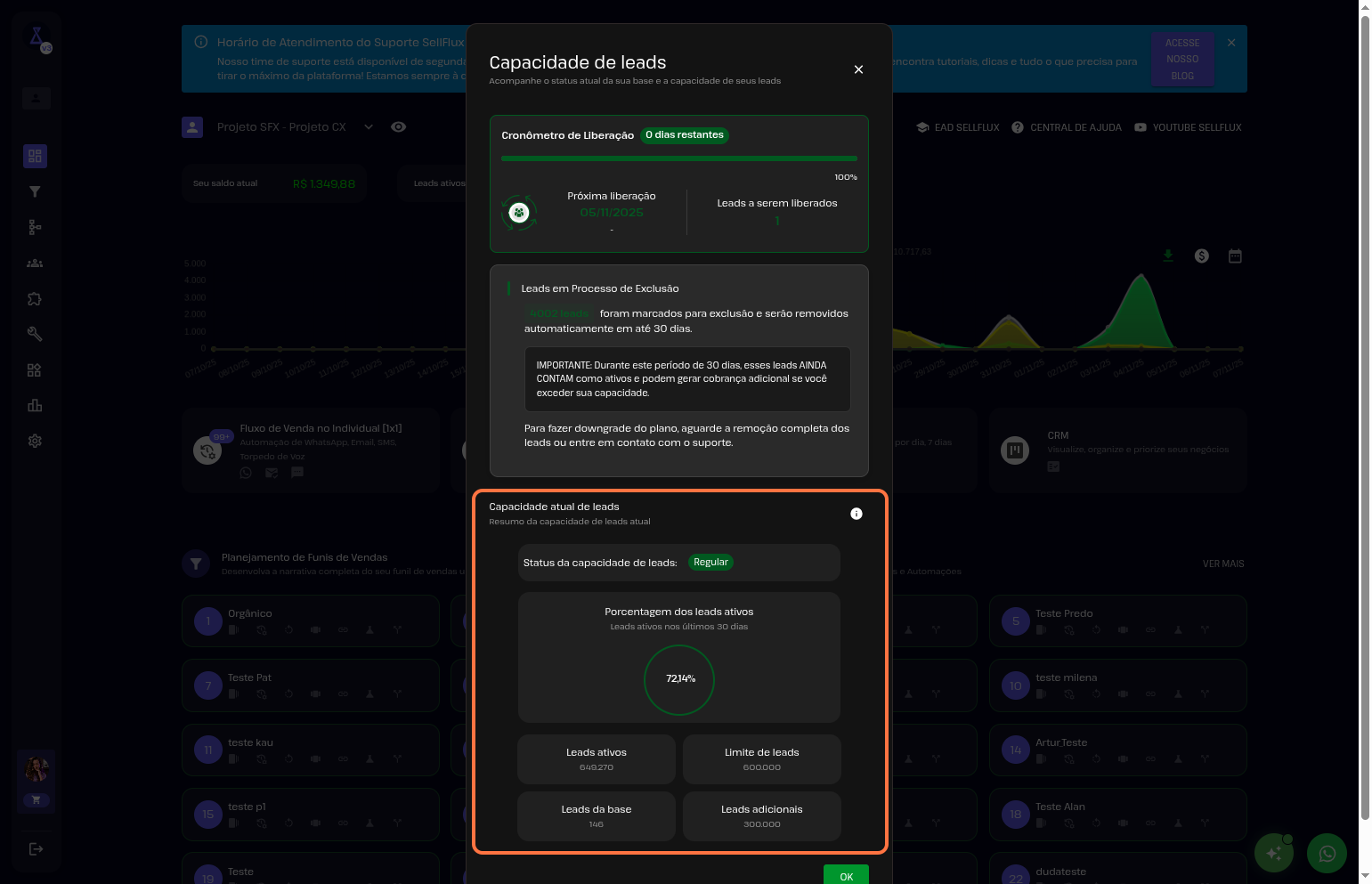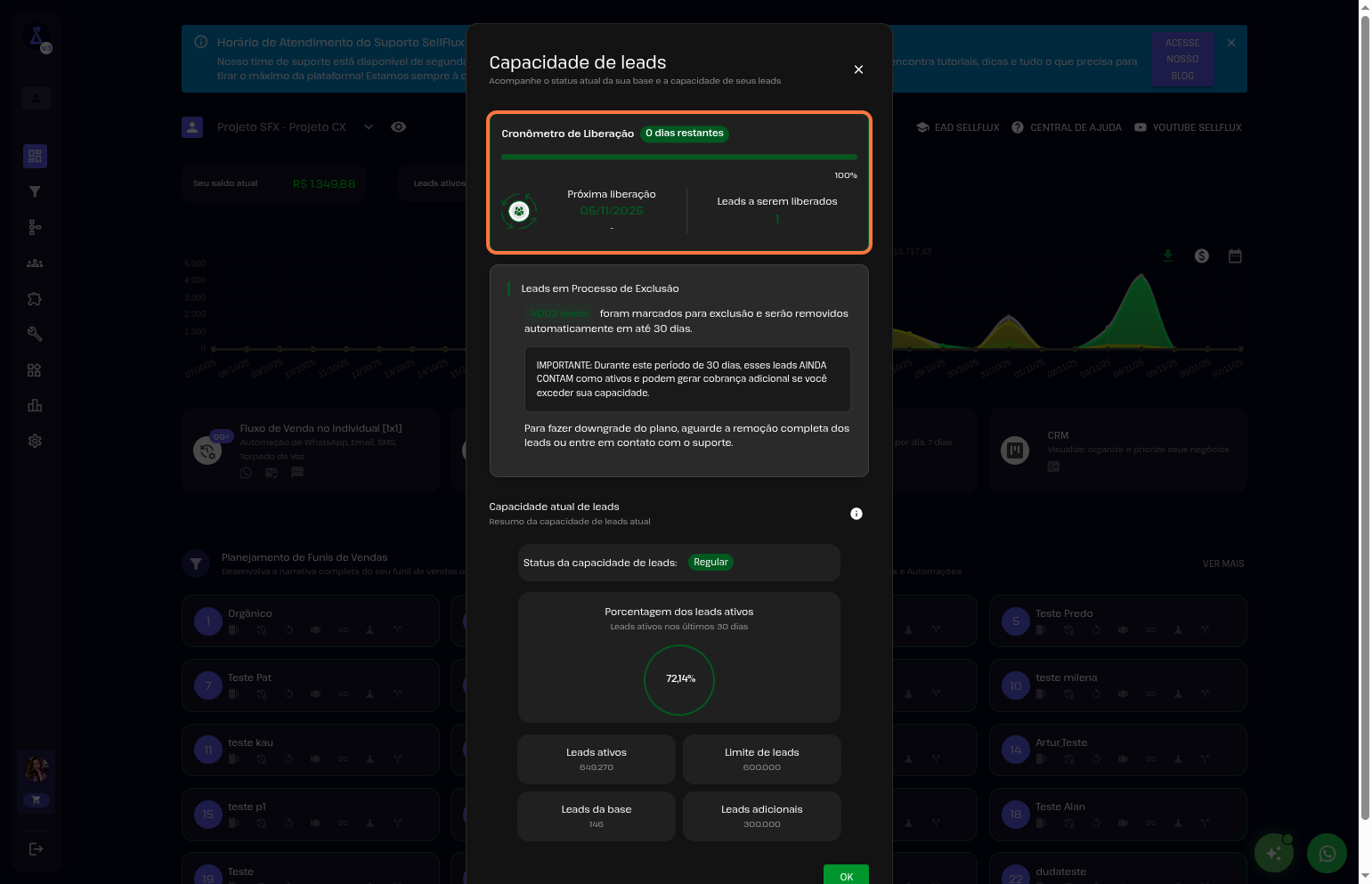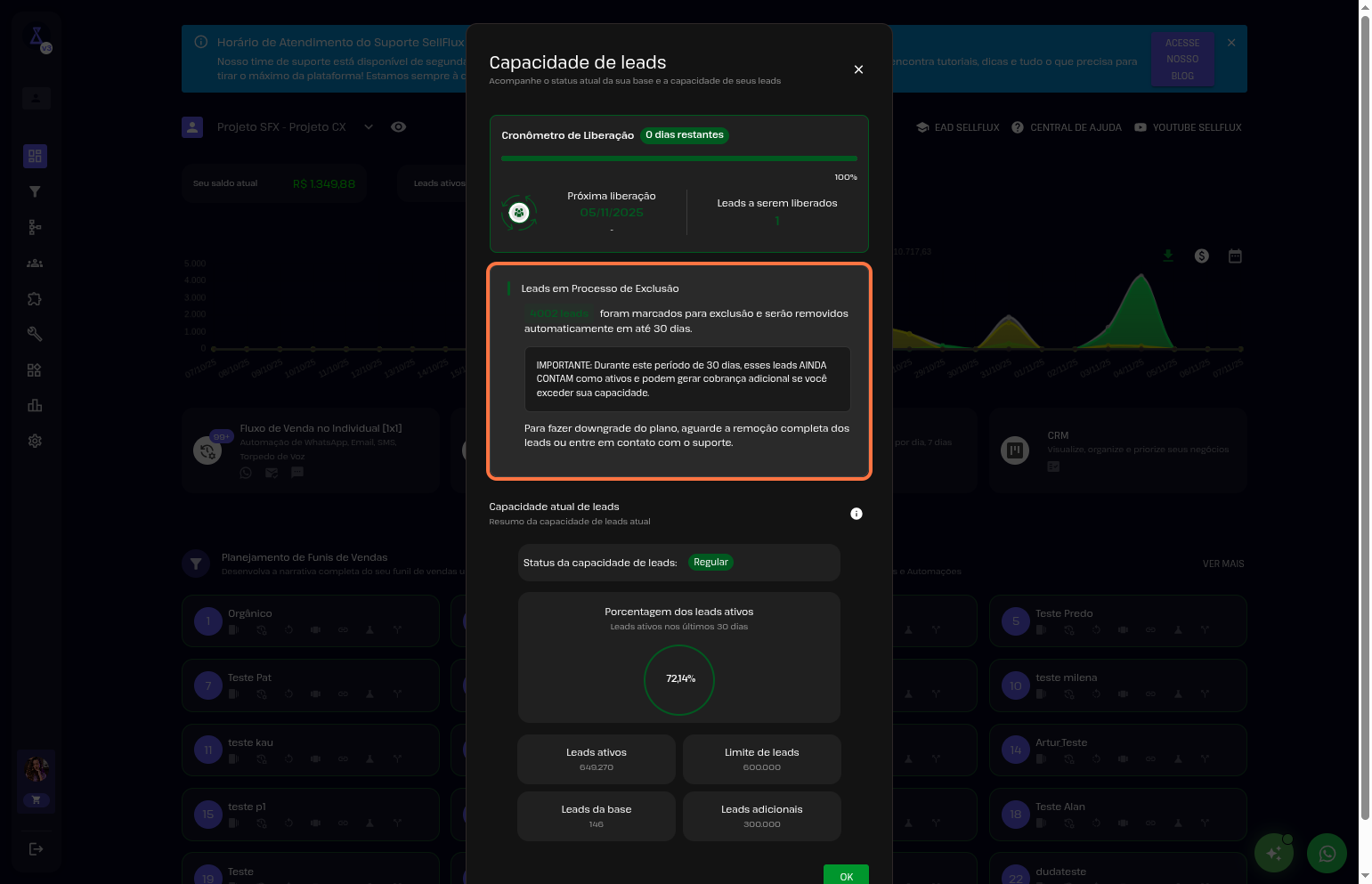 Se a sua base de leads está chegando ao limite e você precisa liberar espaço ou expandir sua capacidade, o SellFlux oferece duas opções simples para manter tudo funcionando perfeitamente.